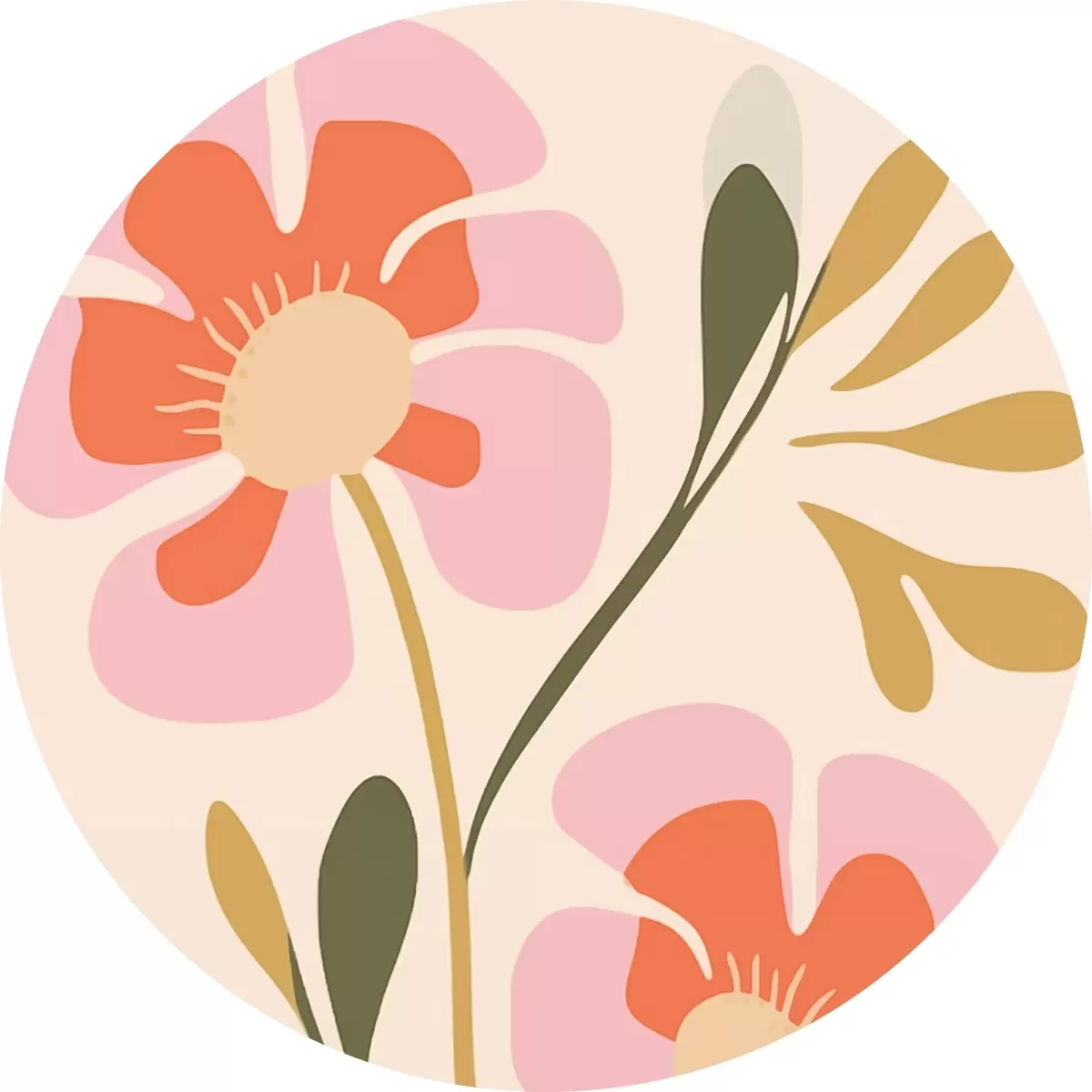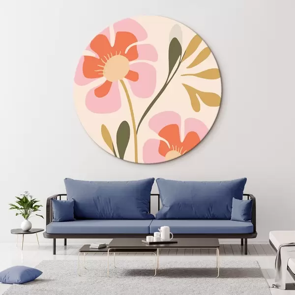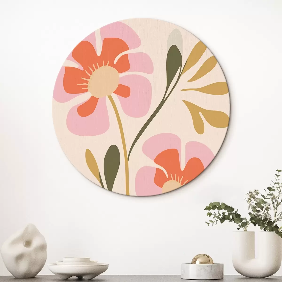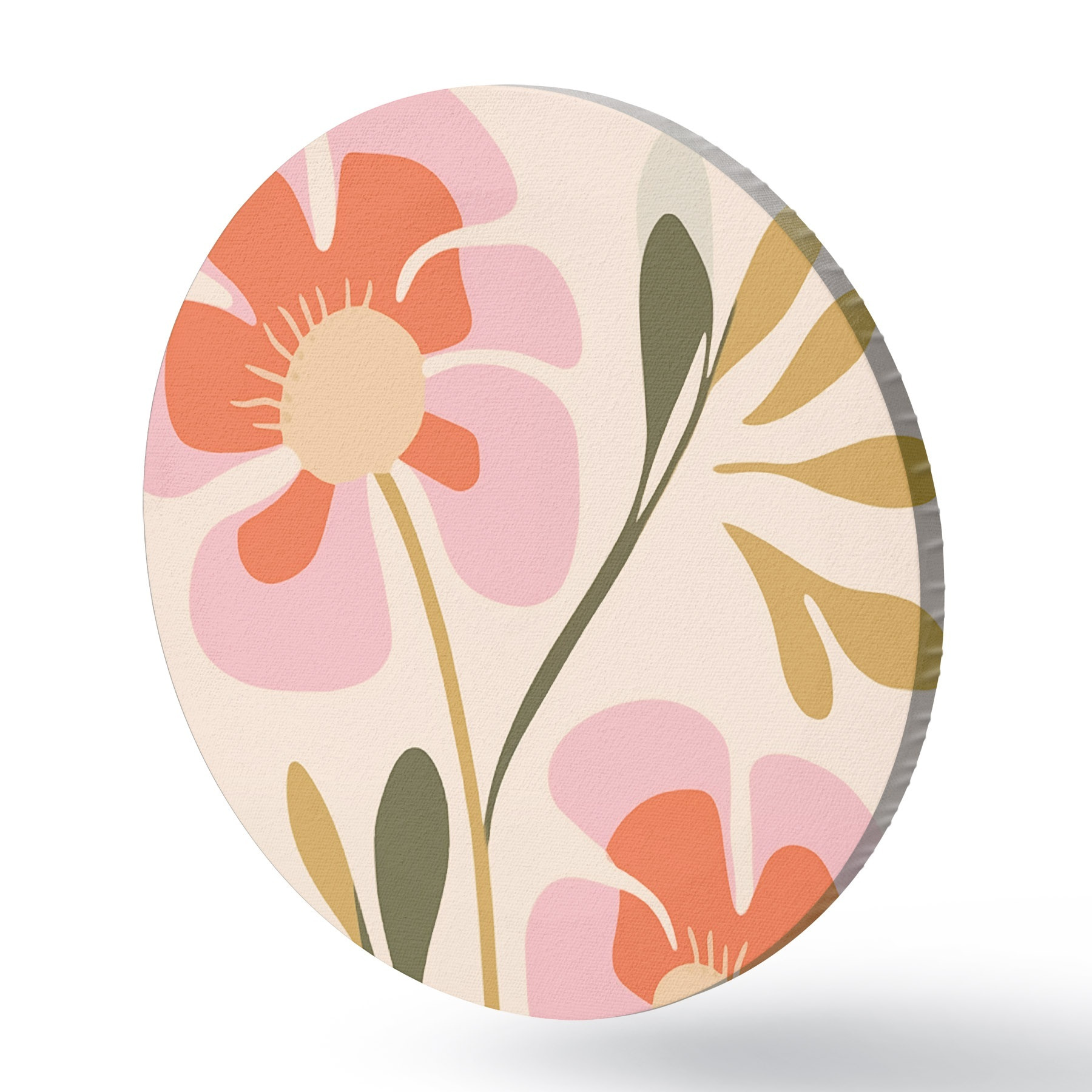 Runde Gemälde Stilisierte rosa und orange Blumen mit grünen Blättern r45140