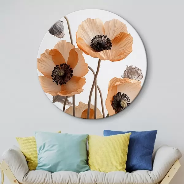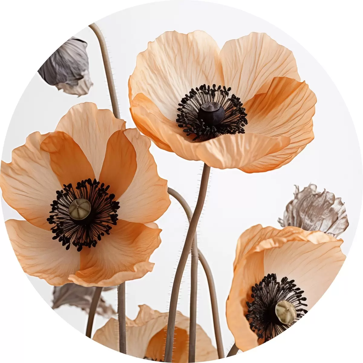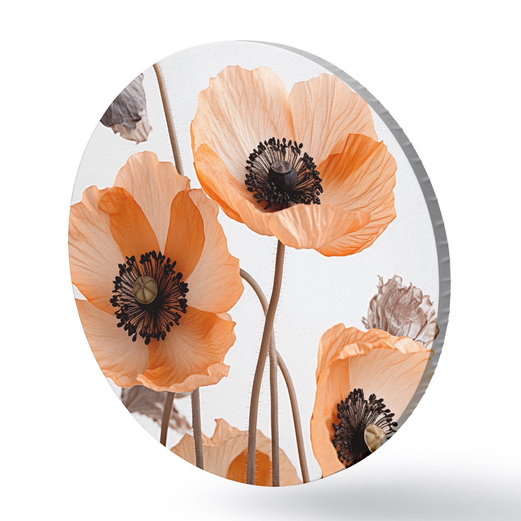 Runde Gemälde Orangefarbene Mohnblumen, getrocknete Blumen vor einem hellen Hintergrund, weiche Beleuchtung, zarte Blütenblätter, Blumenarrangement r45167