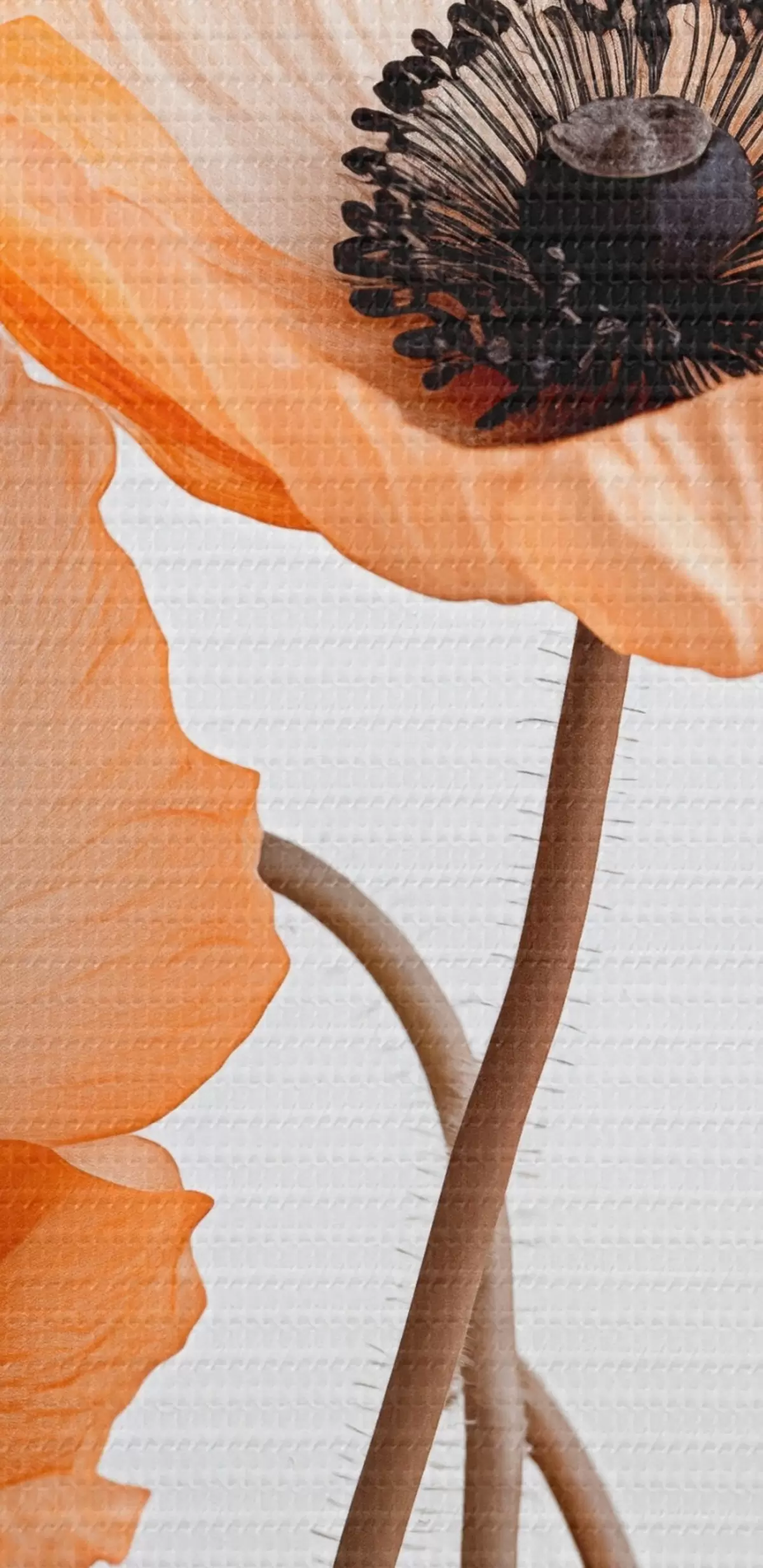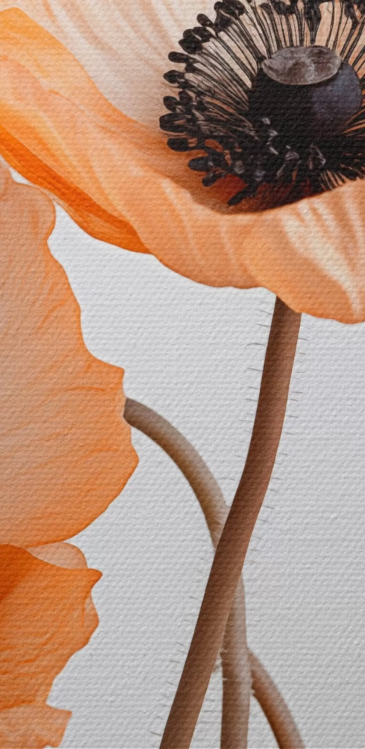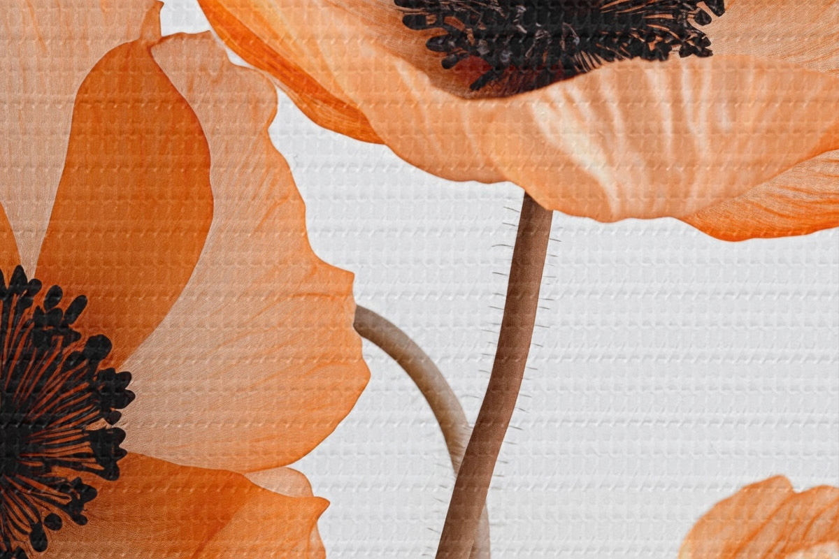 Bild Orangefarbene Mohnblumen, getrocknete Blumen vor einem hellen Hintergrund, weiche Beleuchtung, zarte Blütenblätter, Blumenarrangement Nr r45167