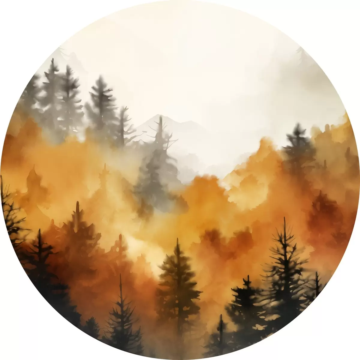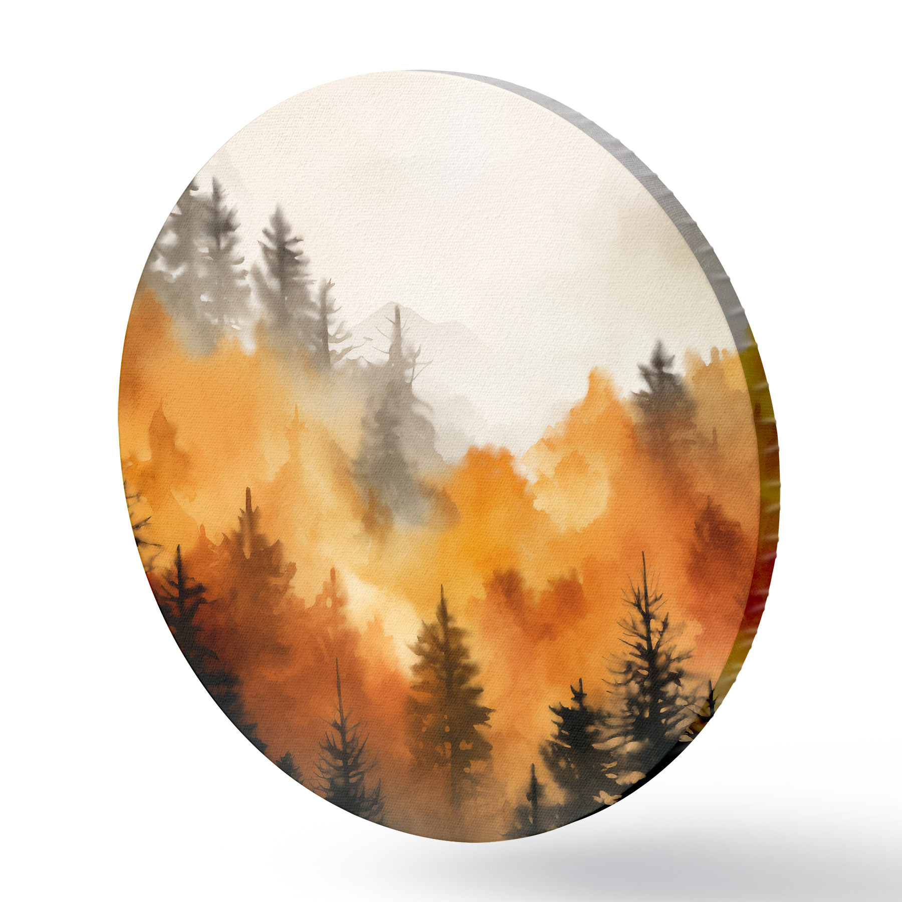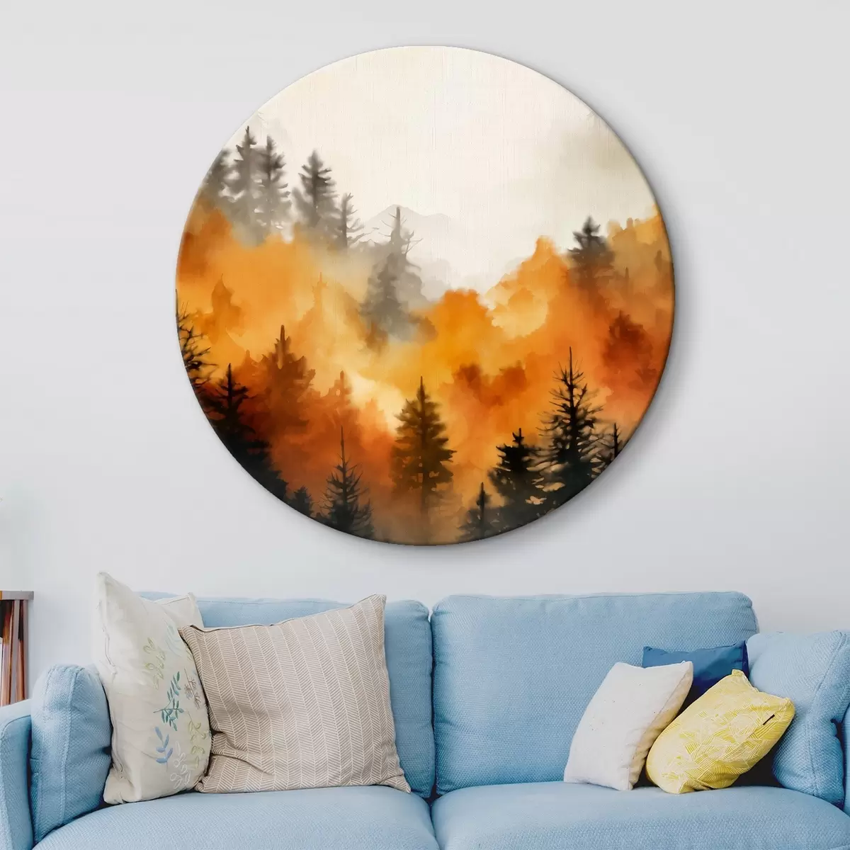 Runde Gemälde Eine Landschaft Aquarell Malerei Nachahmung eines Waldes mit hohen Kiefern und Berge im Hintergrund r45169