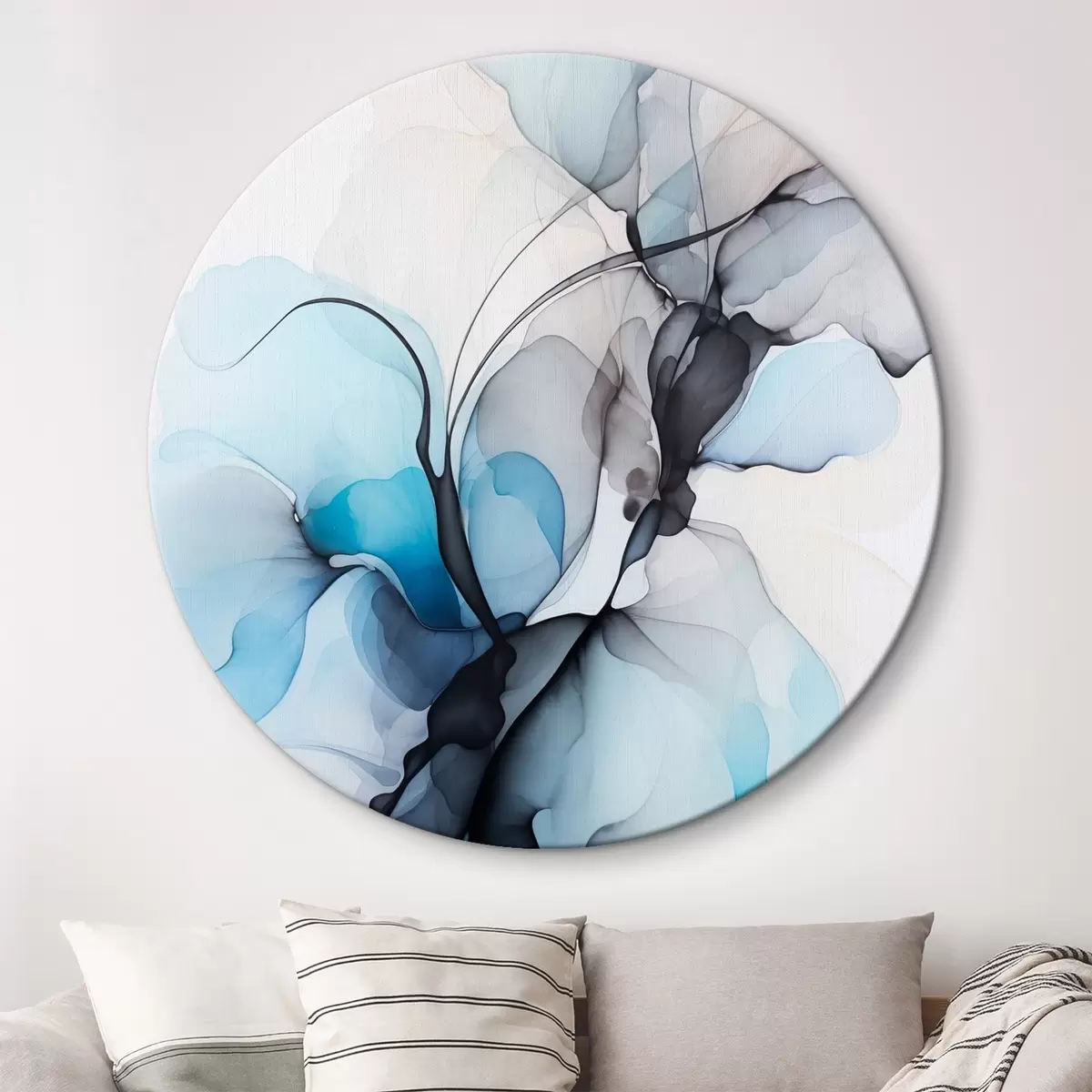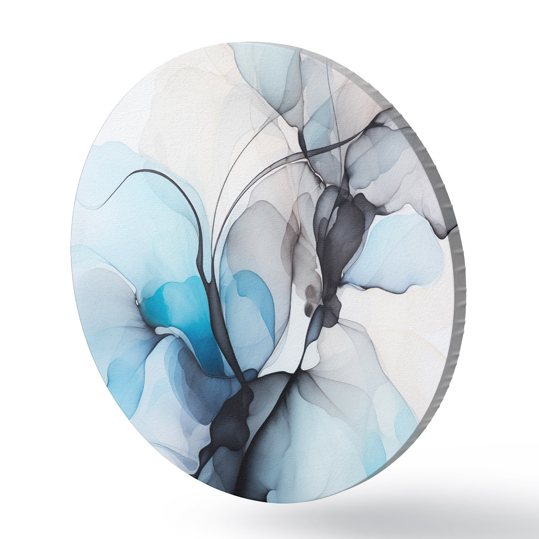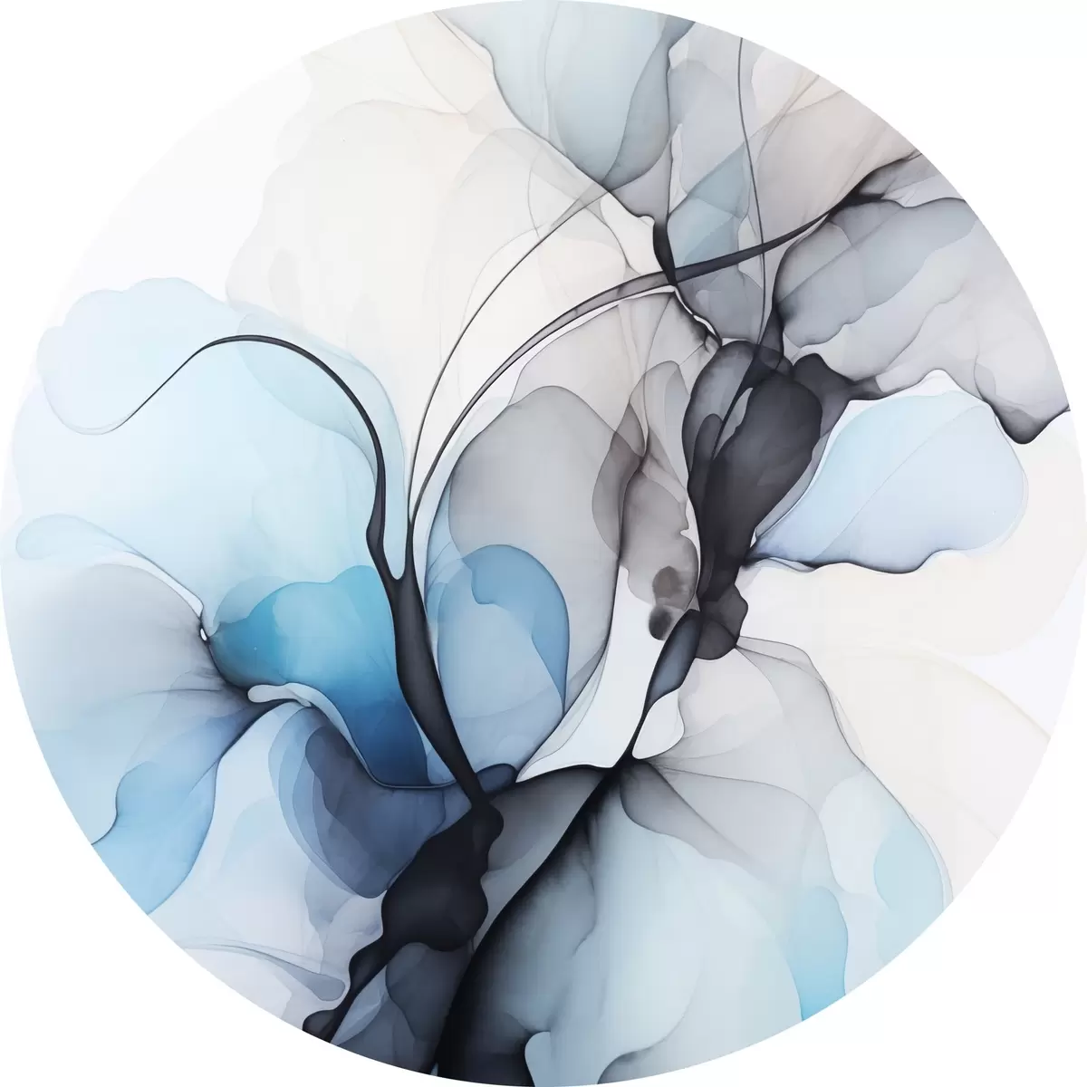 Runde Gemälde Abstrakte Komposition mit fließenden Linien und durchscheinenden Blütenblättern in blauen, weißen und beigen Farbtönen, Alkoholtintenimitation r45177