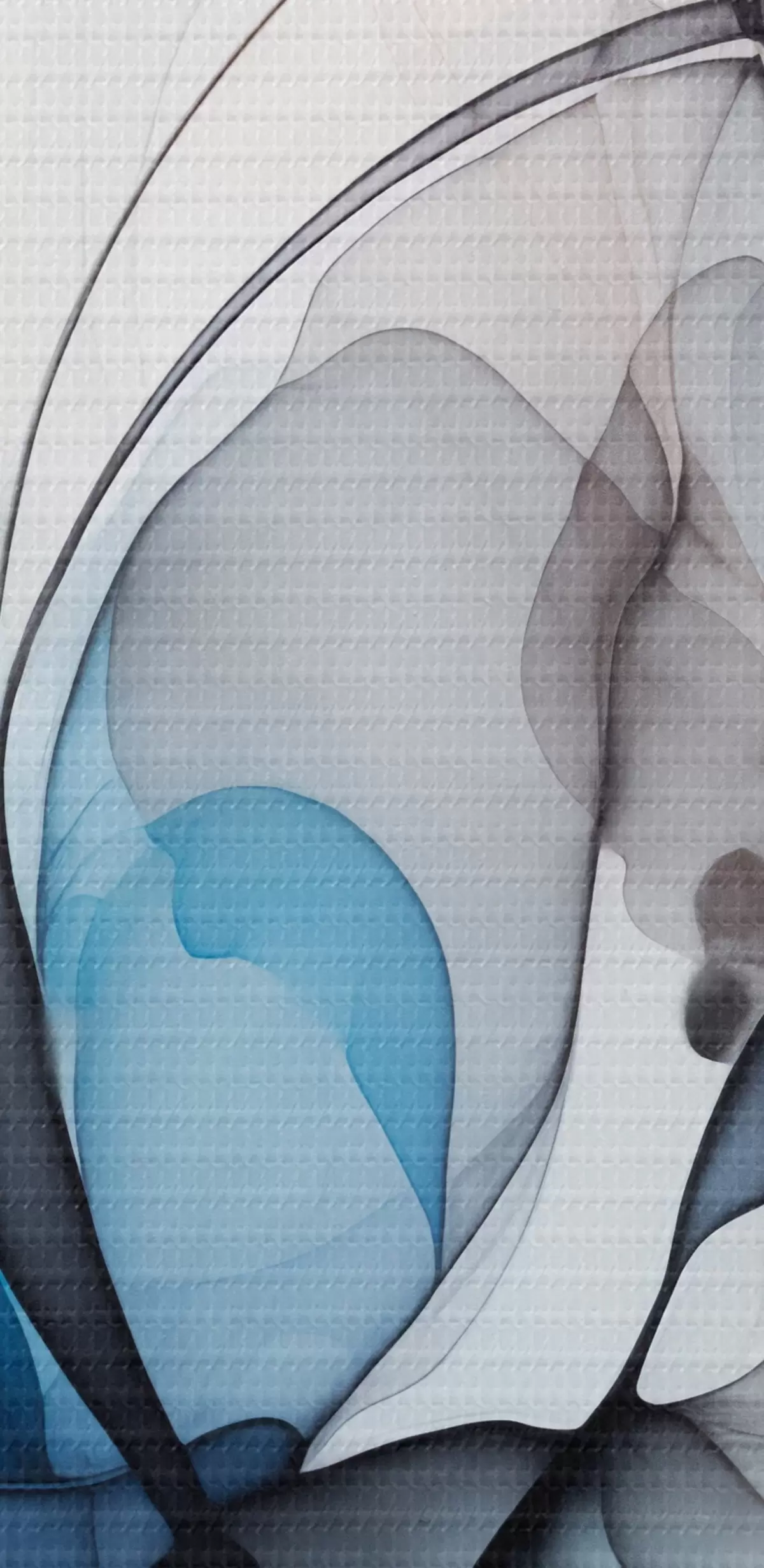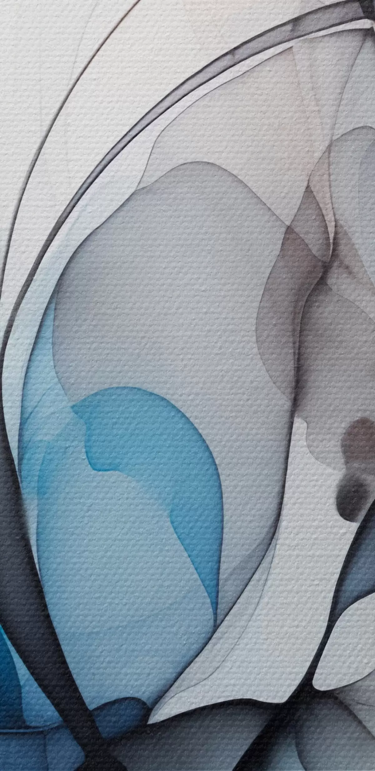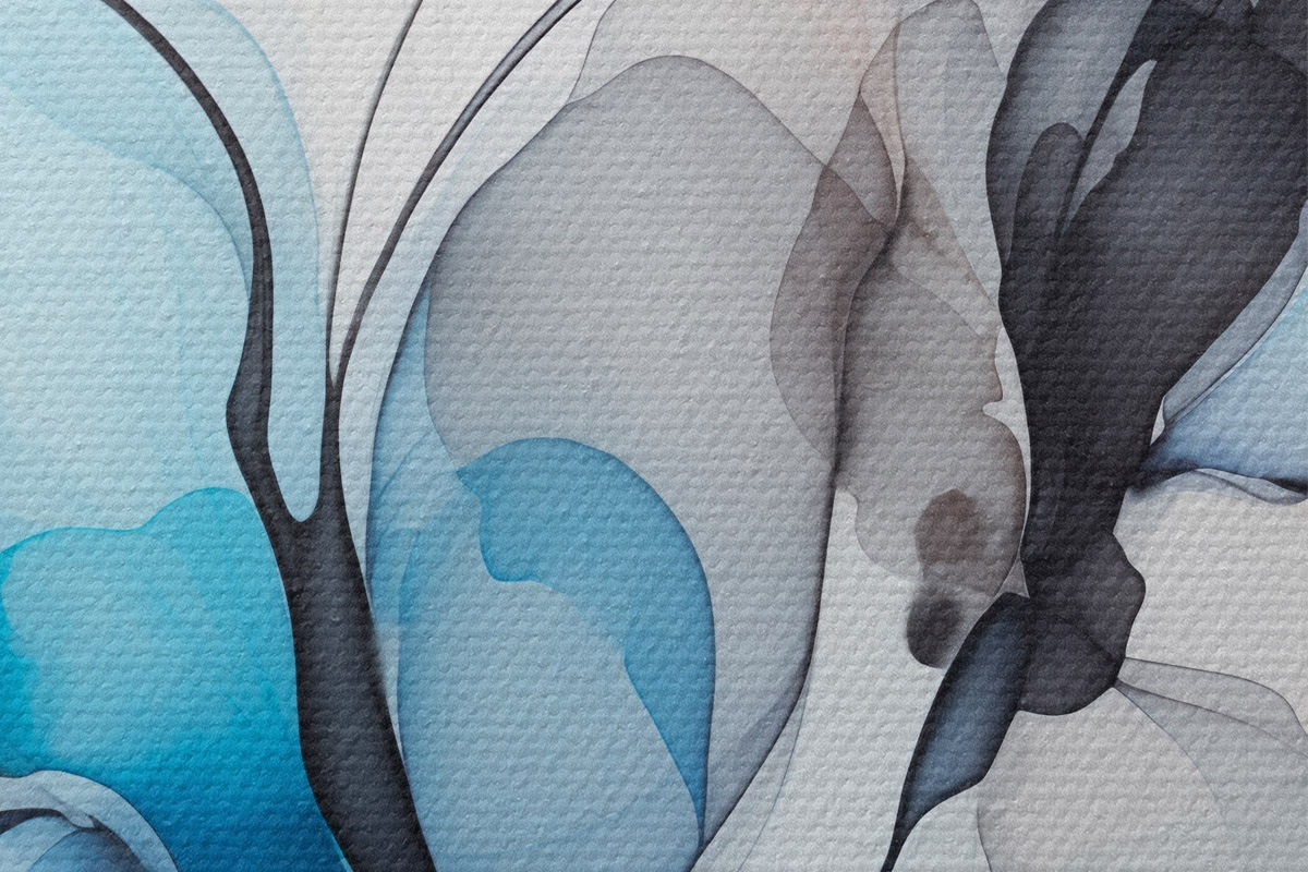 Bild Abstrakte Komposition mit fließenden Linien und durchscheinenden Blütenblättern in blauen, weißen und beigen Farbtönen, Alkoholtintenimitation Nr r45177