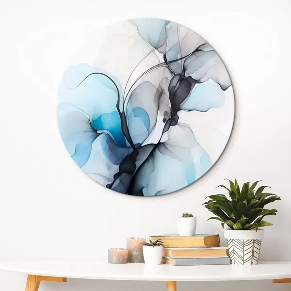 Runde Gemälde Abstrakte Komposition mit fließenden Linien und durchscheinenden Blütenblättern in blauen, weißen und beigen Farbtönen, Alkoholtintenimitation r45177
