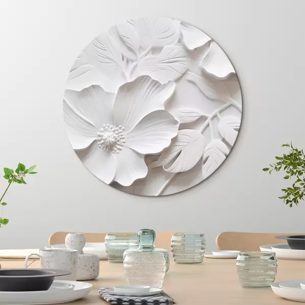 Runde Gemälde Dekorative minimalistische weiße Blumen mit Blättern, Relief-Imitation, weißer Hintergrund r45180