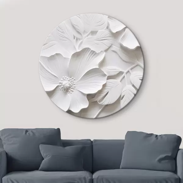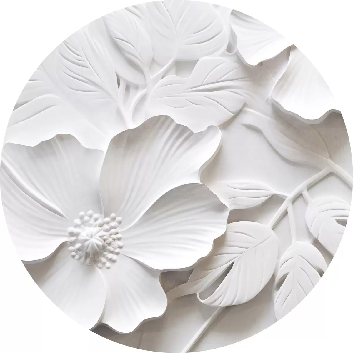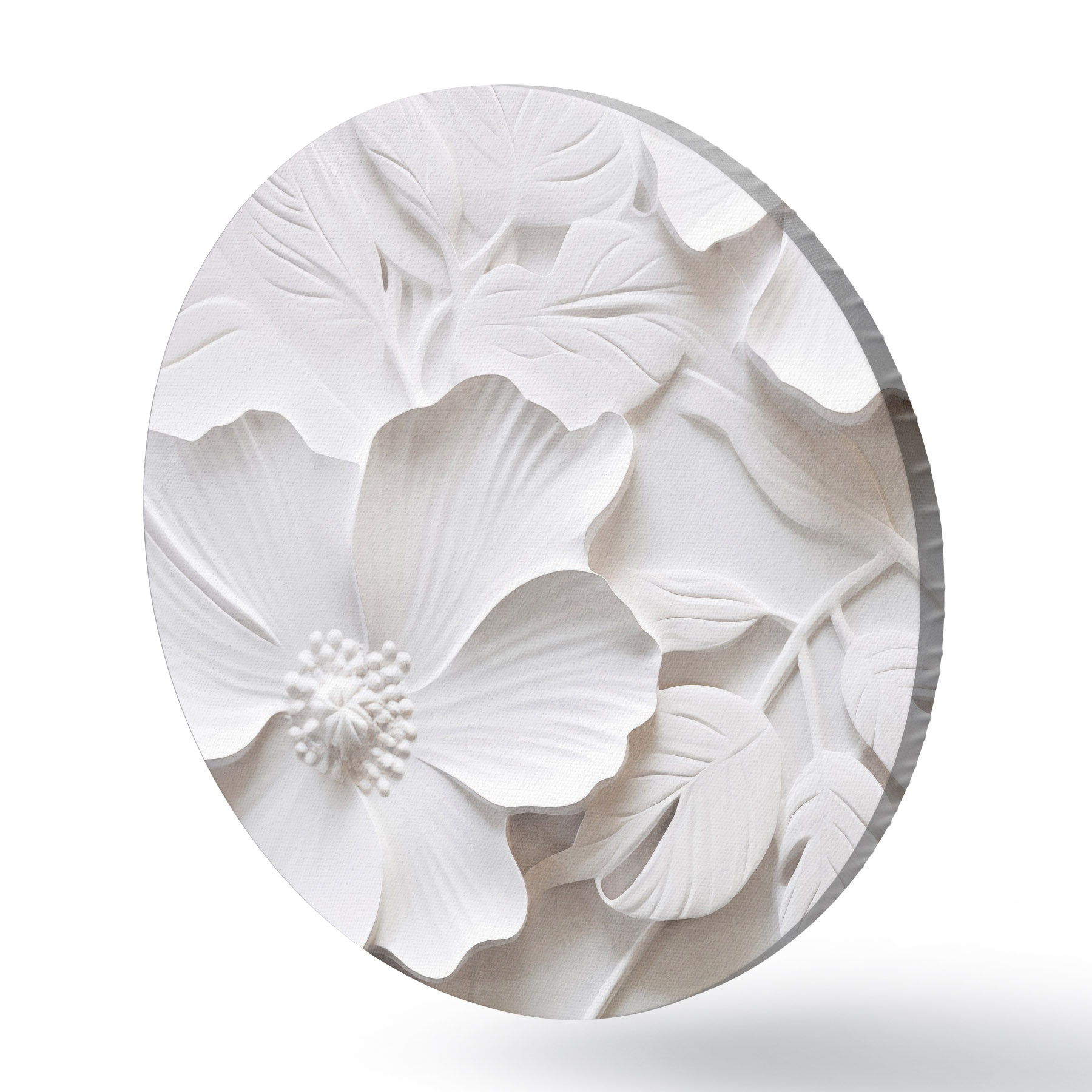 Runde Gemälde Dekorative minimalistische weiße Blumen mit Blättern, Relief-Imitation, weißer Hintergrund r45180