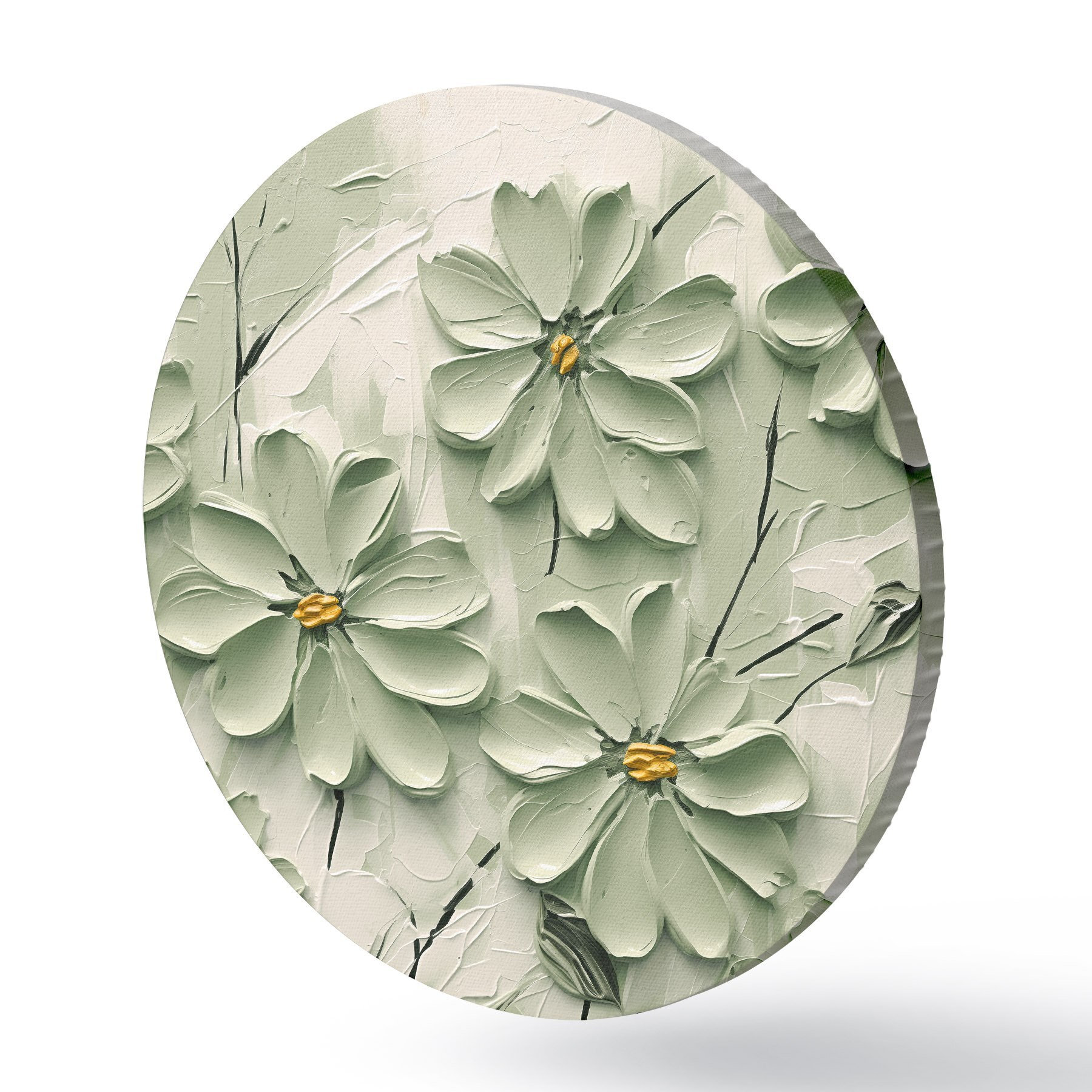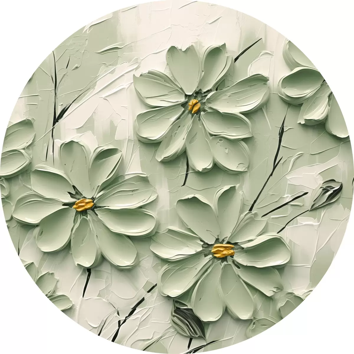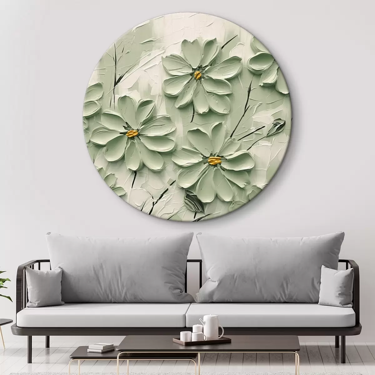 Runde Gemälde Grüne Blumen mit gelben Zentren gemalt in dicken Pinselstrichen auf einem hellen Hintergrund r45265