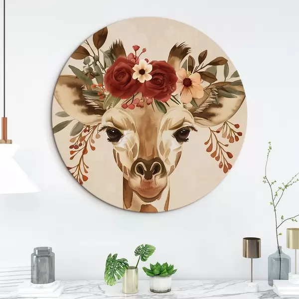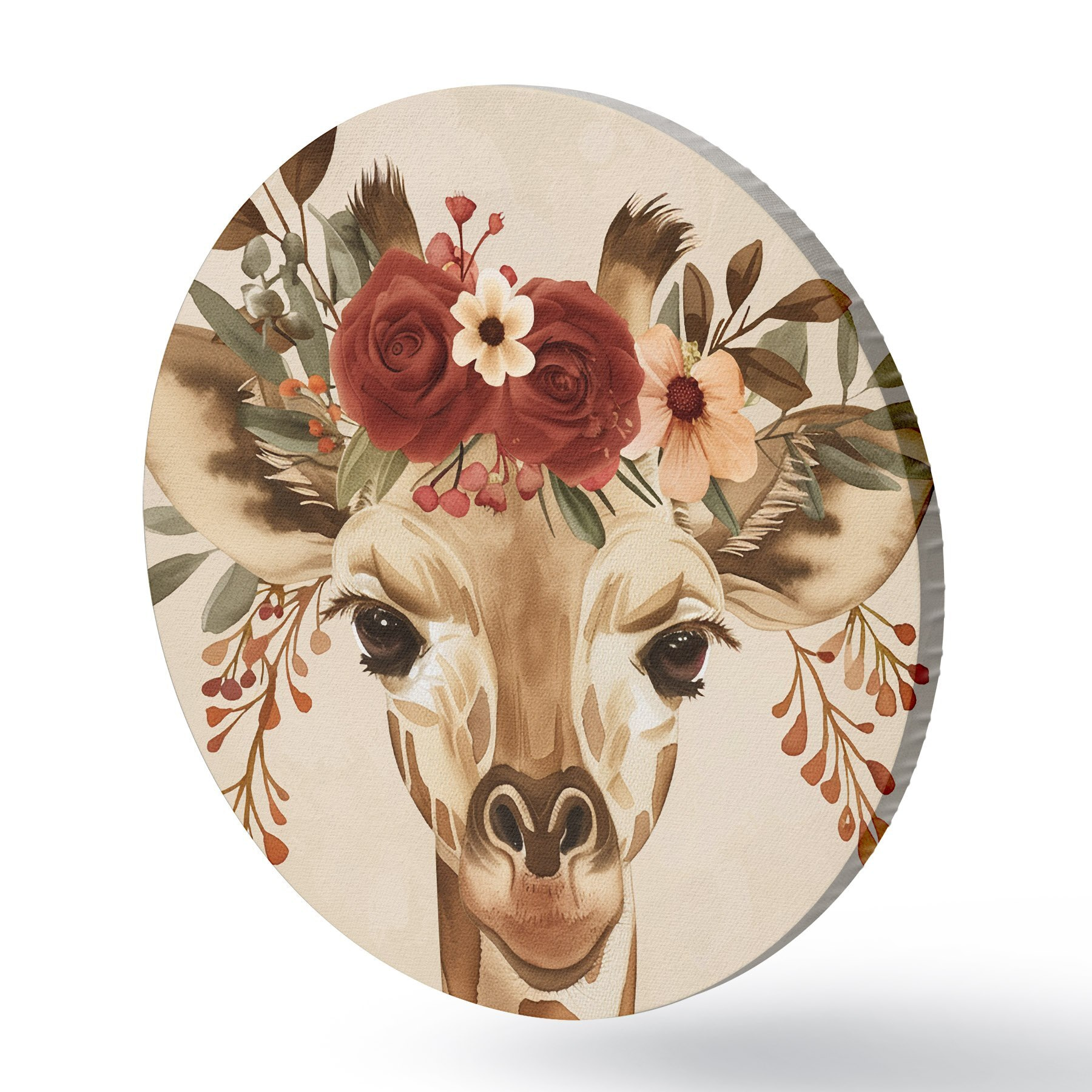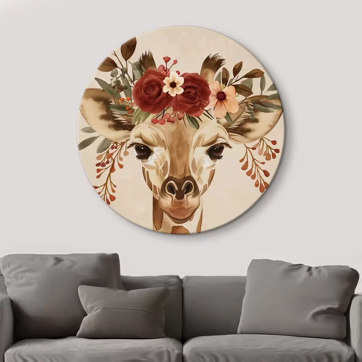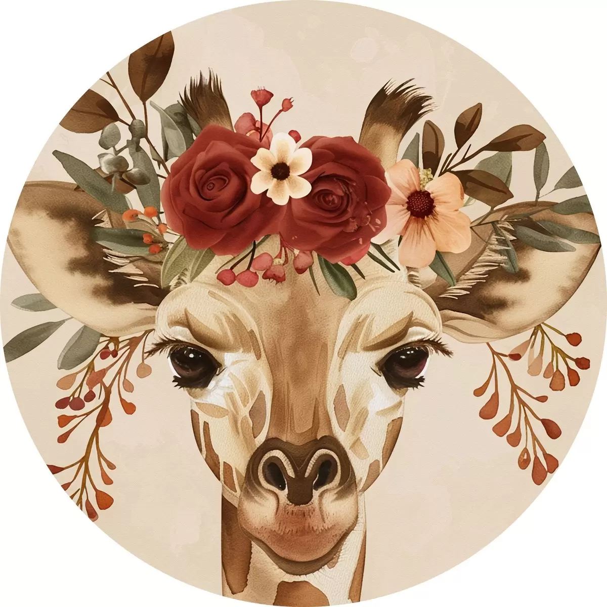 Runde Gemälde Giraffe im Aquarellstil mit Blumen auf dem Kopf r45331
