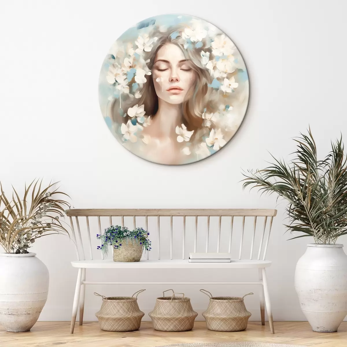 Runde Gemälde Abstraktes Porträt einer Frau mit Blumen in Form von Pinselstrichen r45450