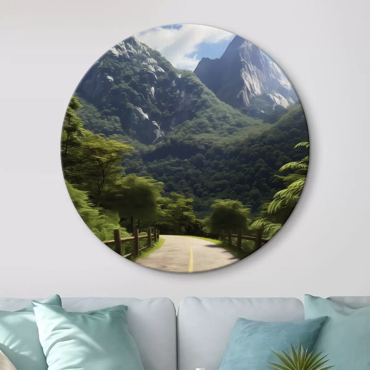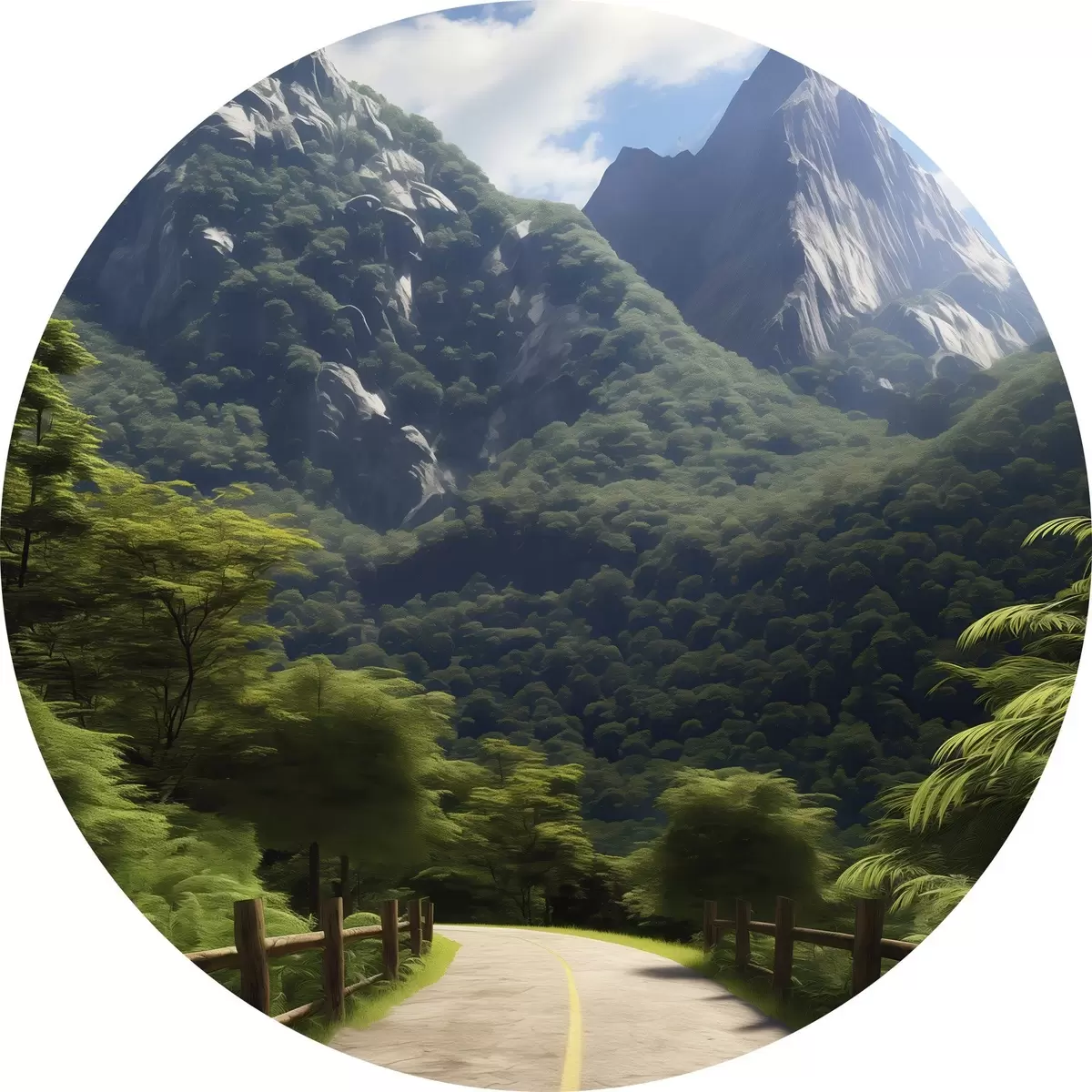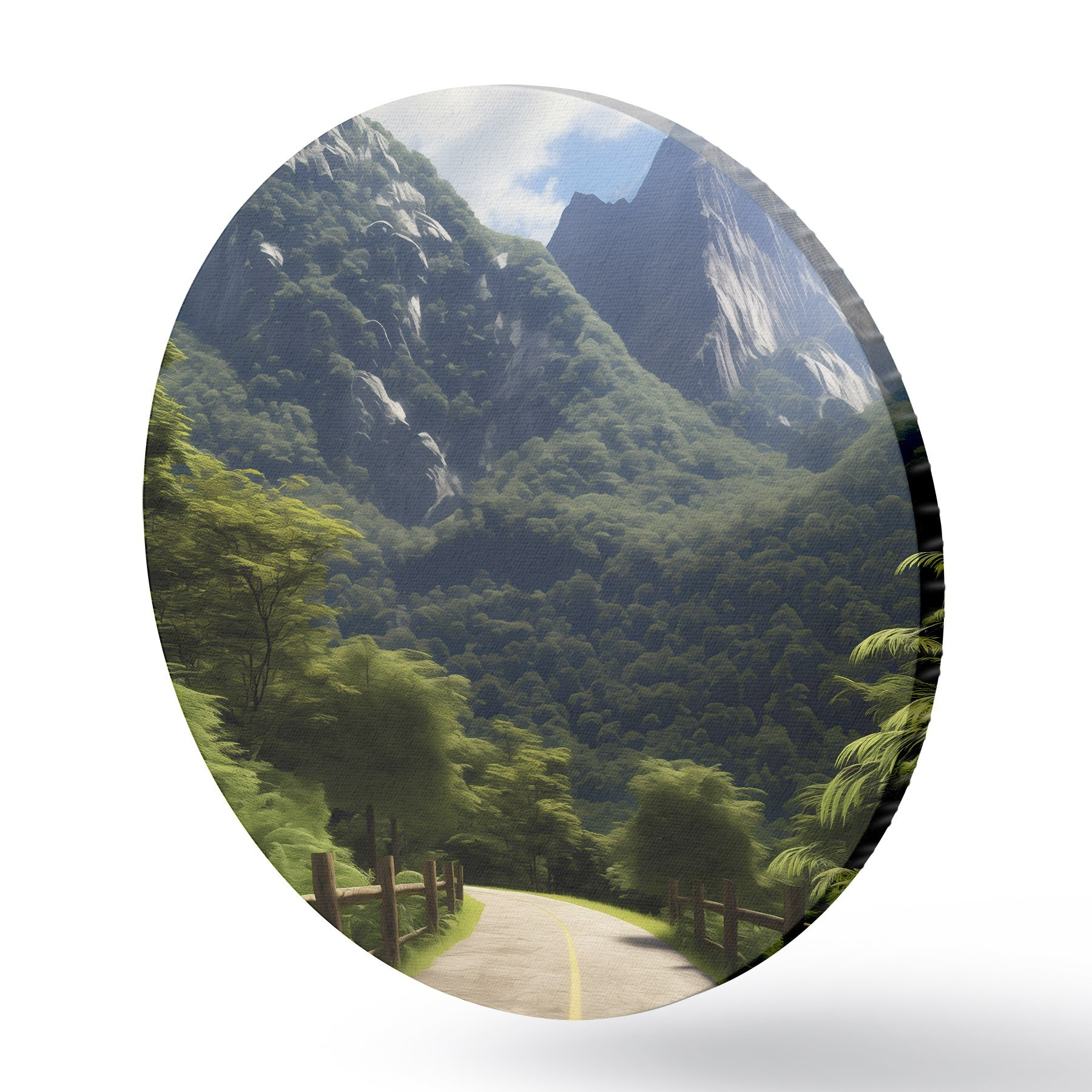 Runde Gemälde Bergstraße zwischen grünen Bäumen r45525