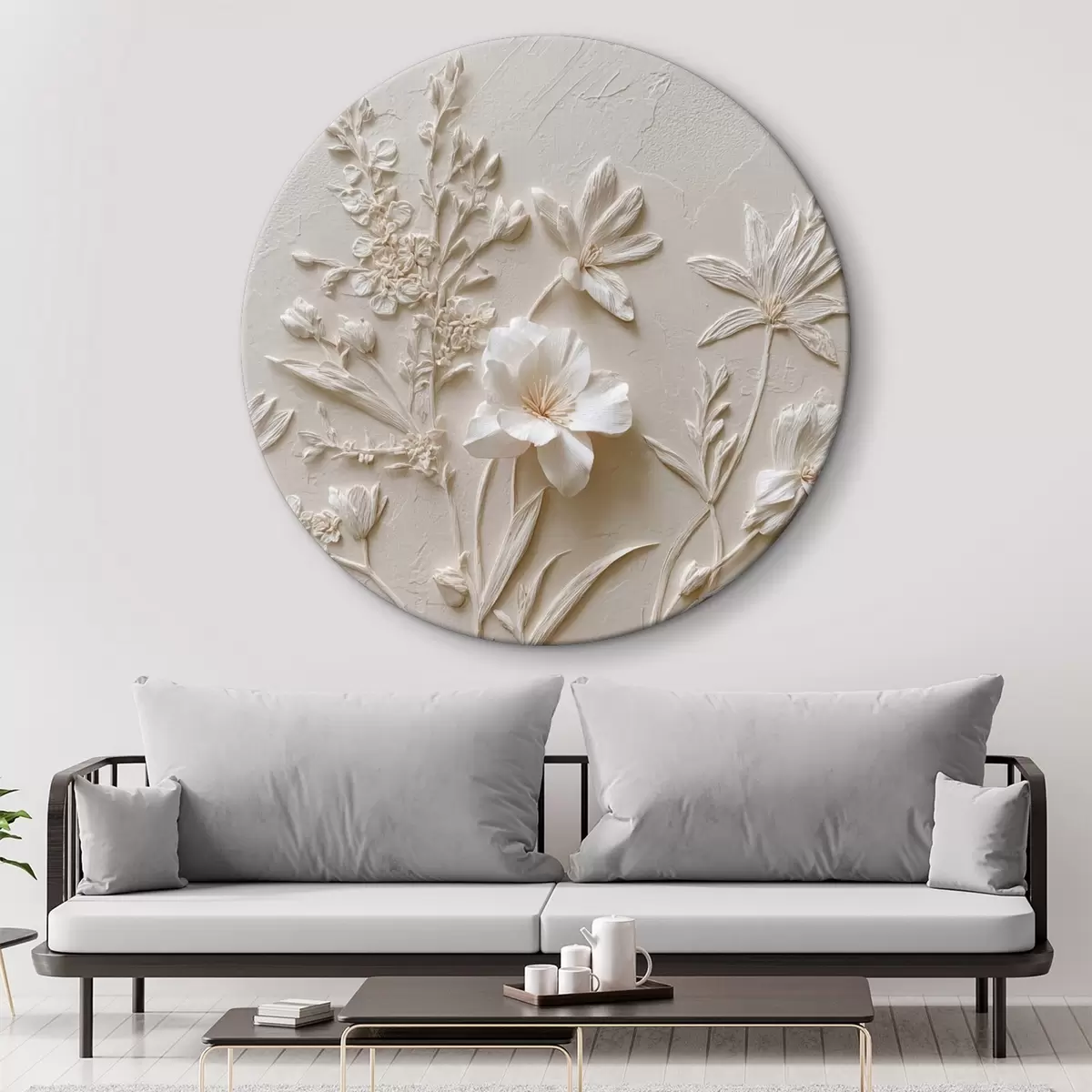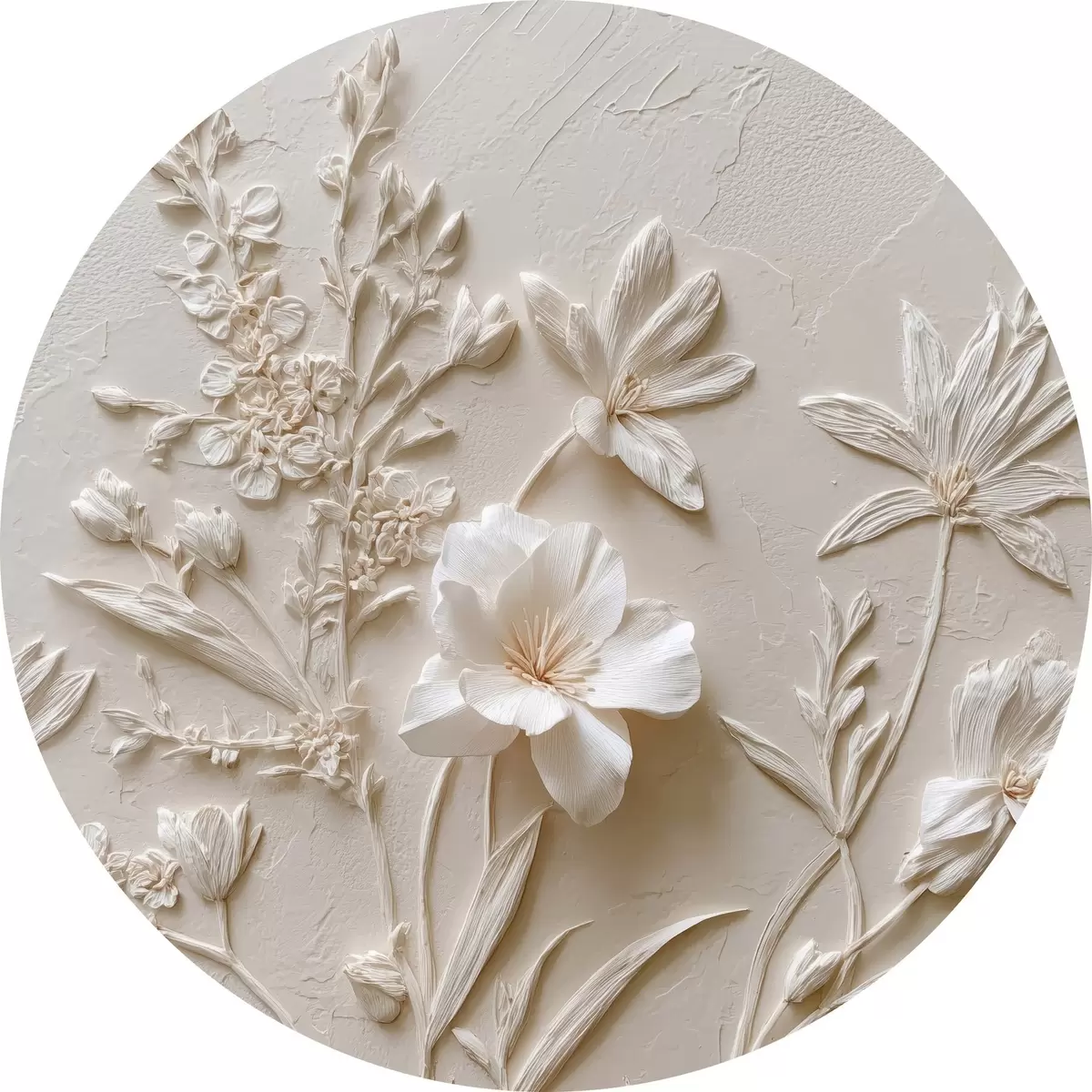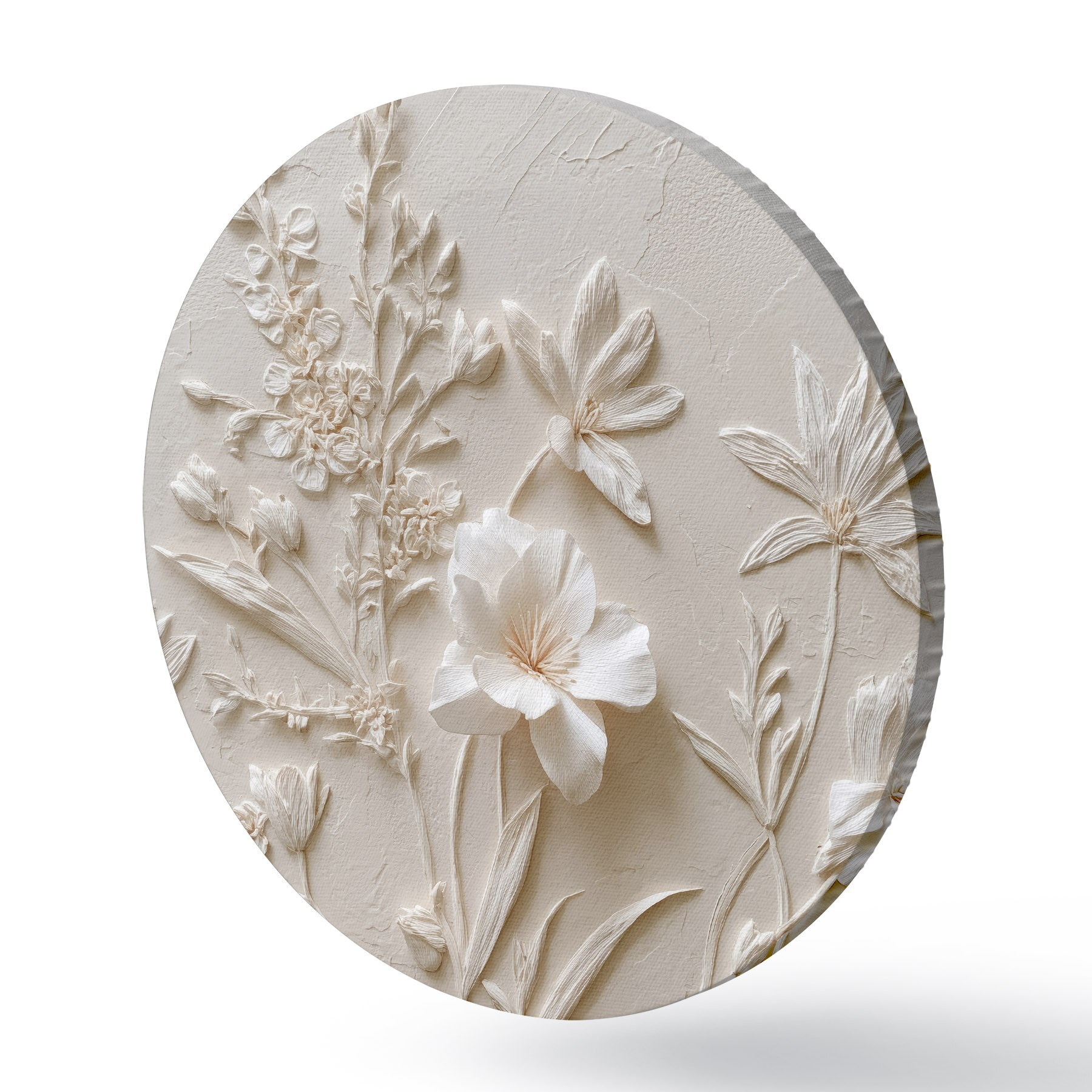 Runde Gemälde Blumenmotiv: Basrelief mit Pflanzen auf hellem Hintergrund r45536