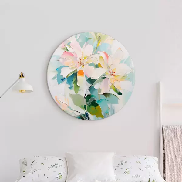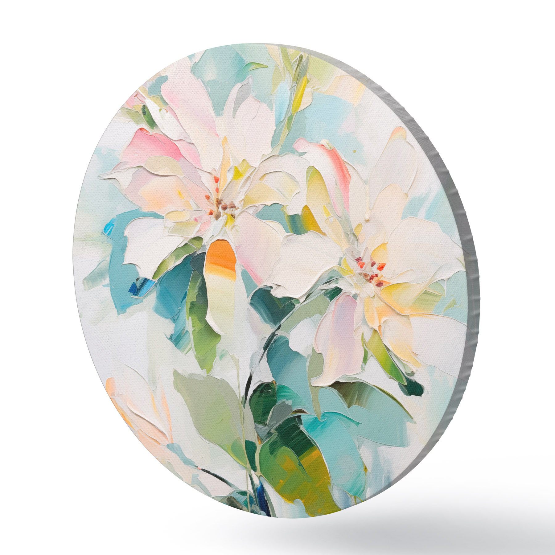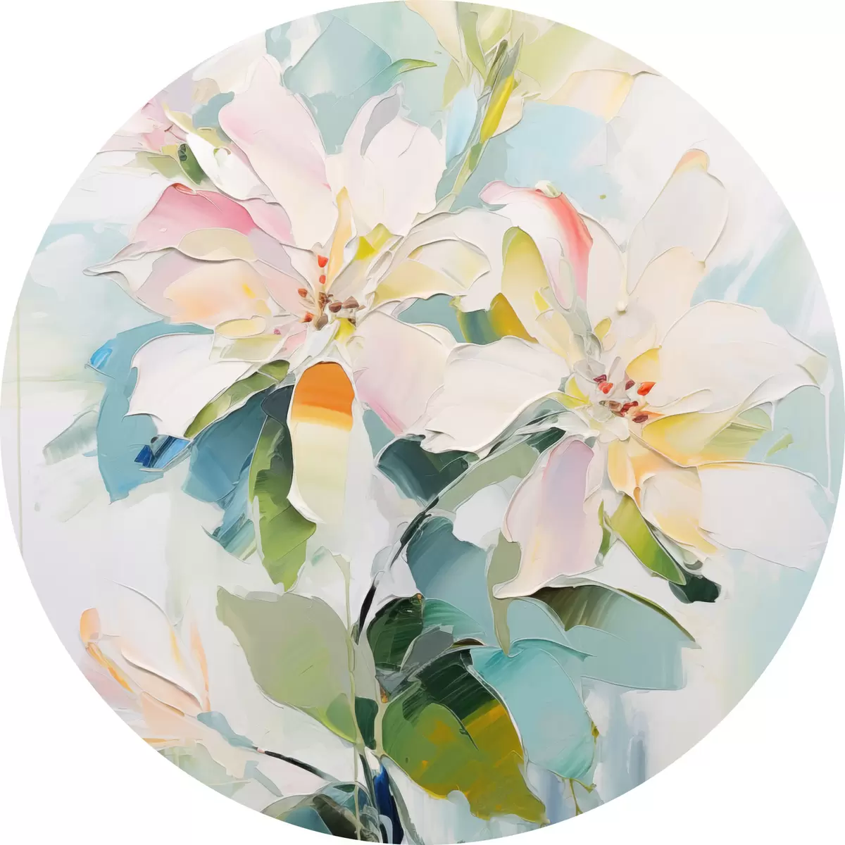 Runde Gemälde Blumen mit bunten Akzenten, grüne Blätter, weiche Pinselstriche Ölgemälde Nachahmung, hellblauem Hintergrund r45549
