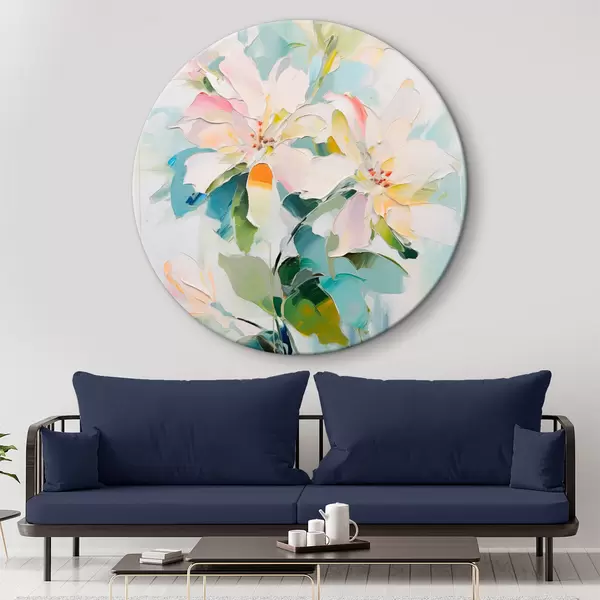 Runde Gemälde Blumen mit bunten Akzenten, grüne Blätter, weiche Pinselstriche Ölgemälde Nachahmung, hellblauem Hintergrund r45549