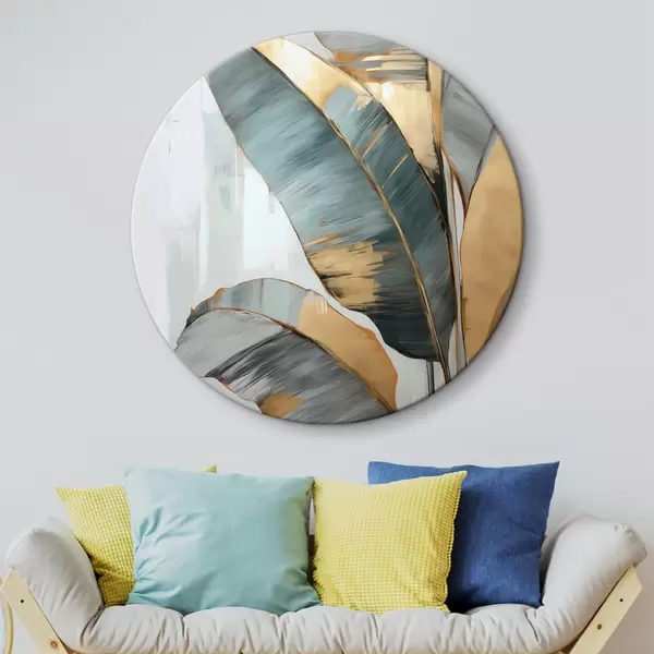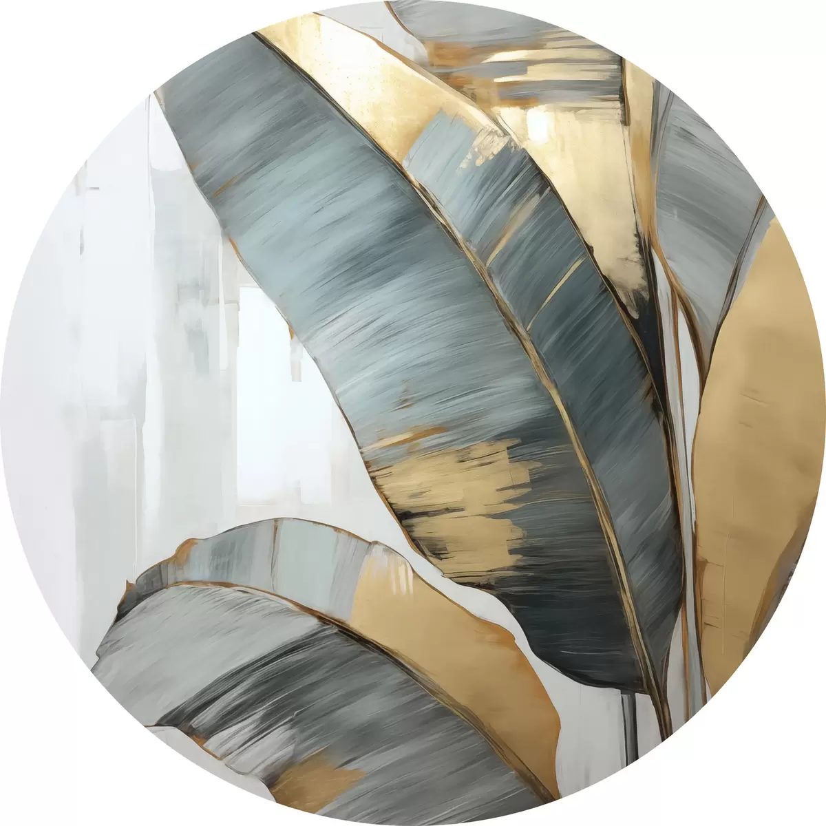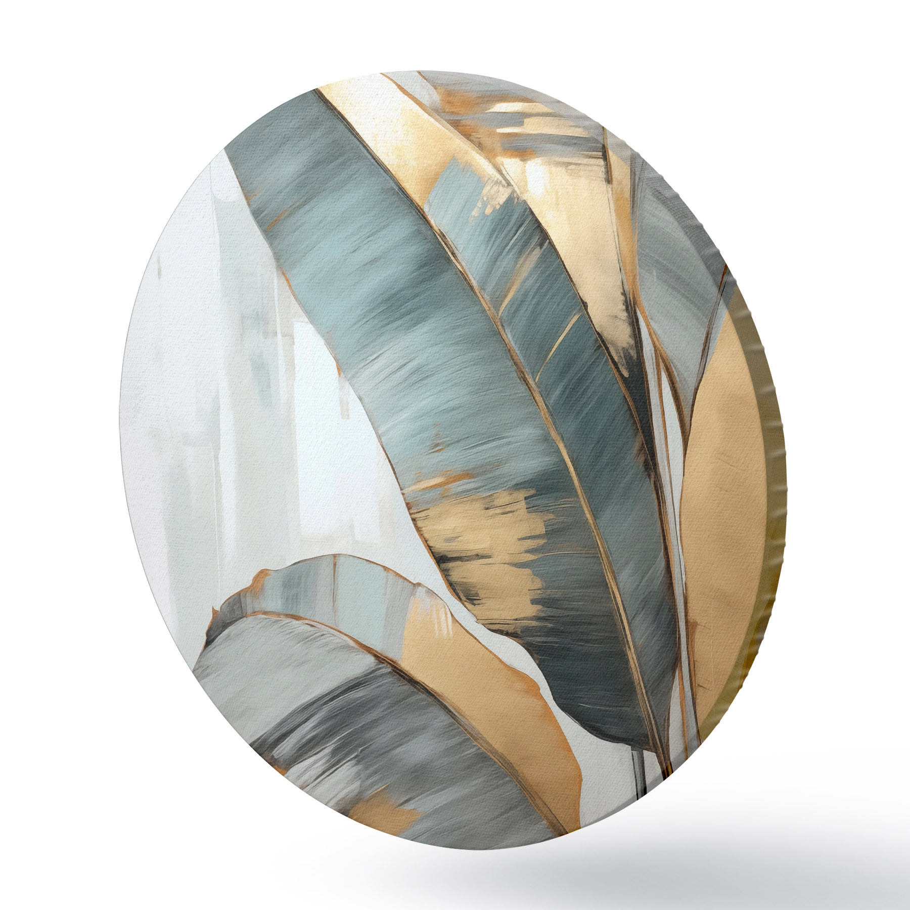 Runde Gemälde Eine Reihe von gedämpften blauen, grauen und gelben Bananenblättern mit sichtbaren Pinselstrichen vor einem weißen abstrakten Hintergrund r45551