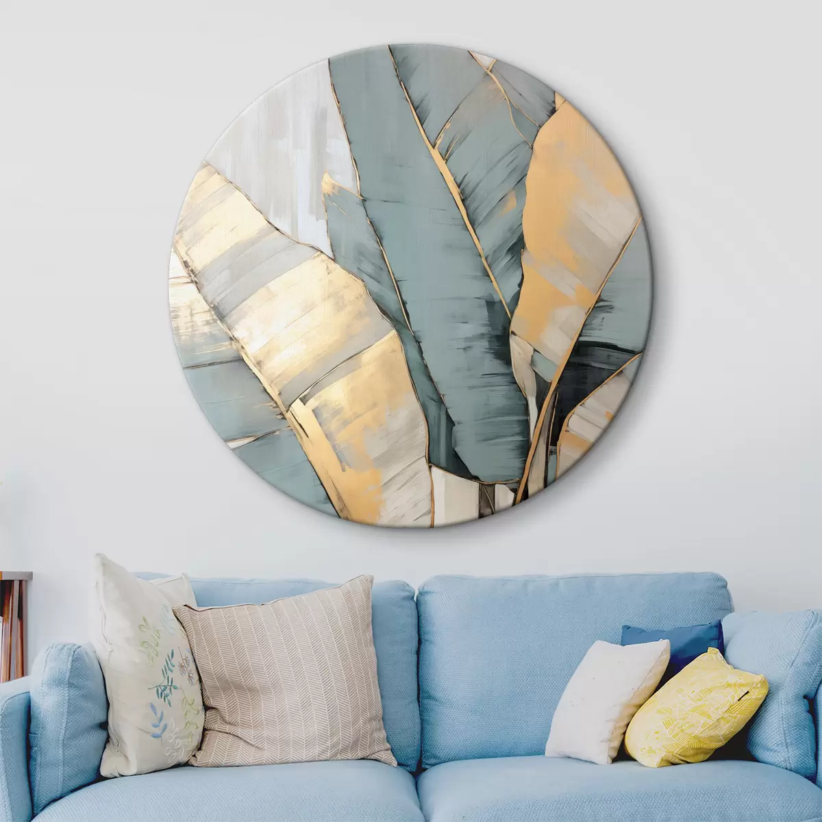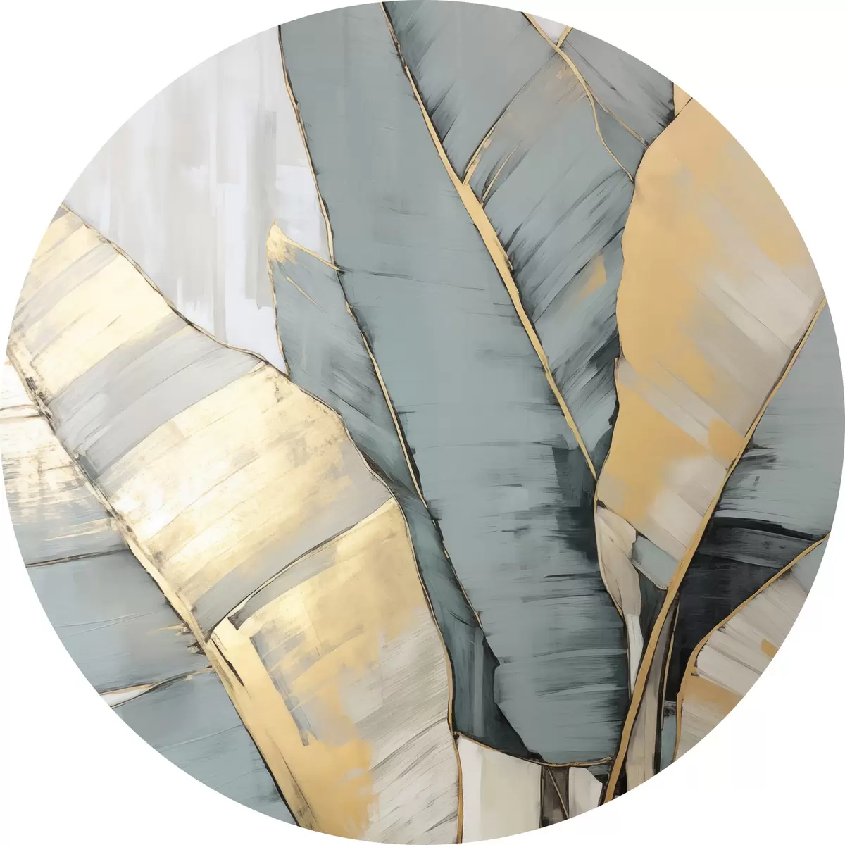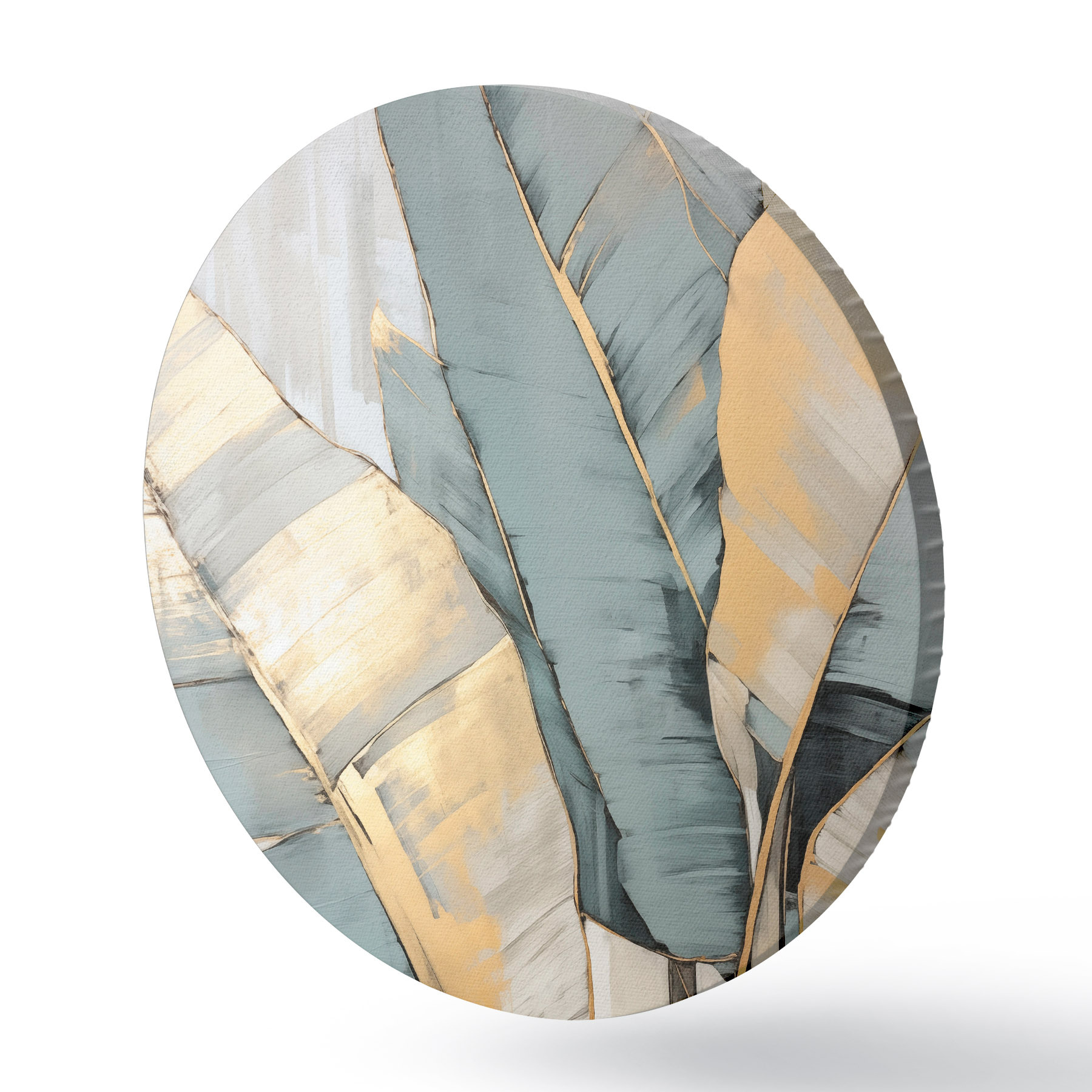 Runde Gemälde Gedämpfte blaue, graue und gelbe Bananenblätter mit sichtbaren Pinselstrichen vor einem weißen abstrakten Hintergrund r45552