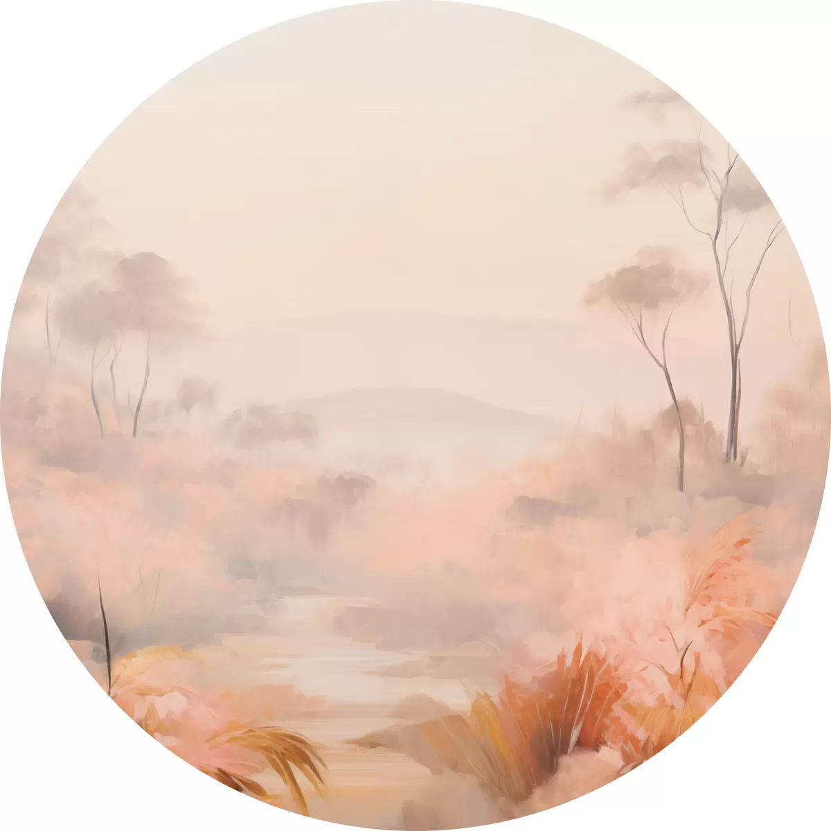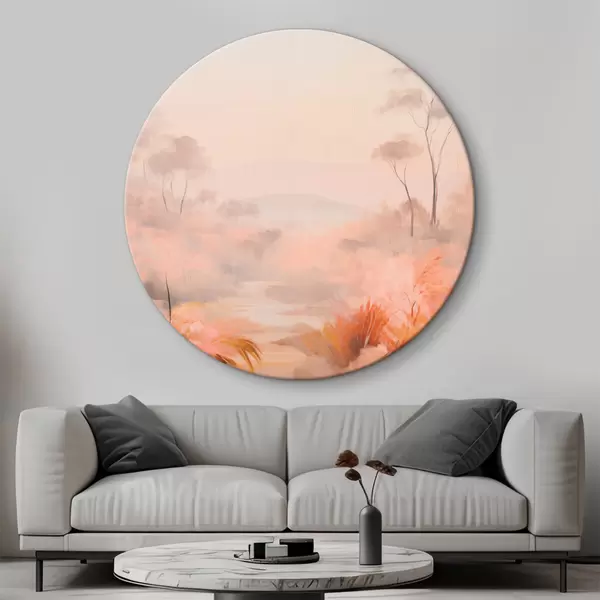 Runde Gemälde Eine Landschaft mit Sträuchern und Bäumen in Rosa-, Orange- und Brauntönen, mit Bergen im Hintergrund r45553