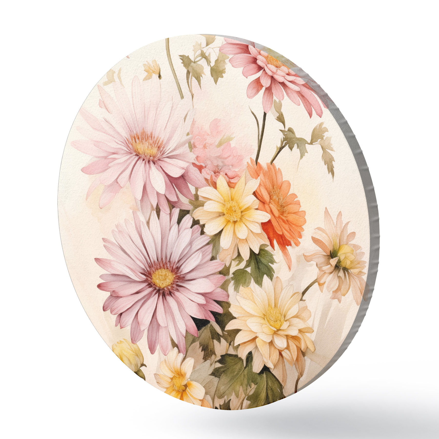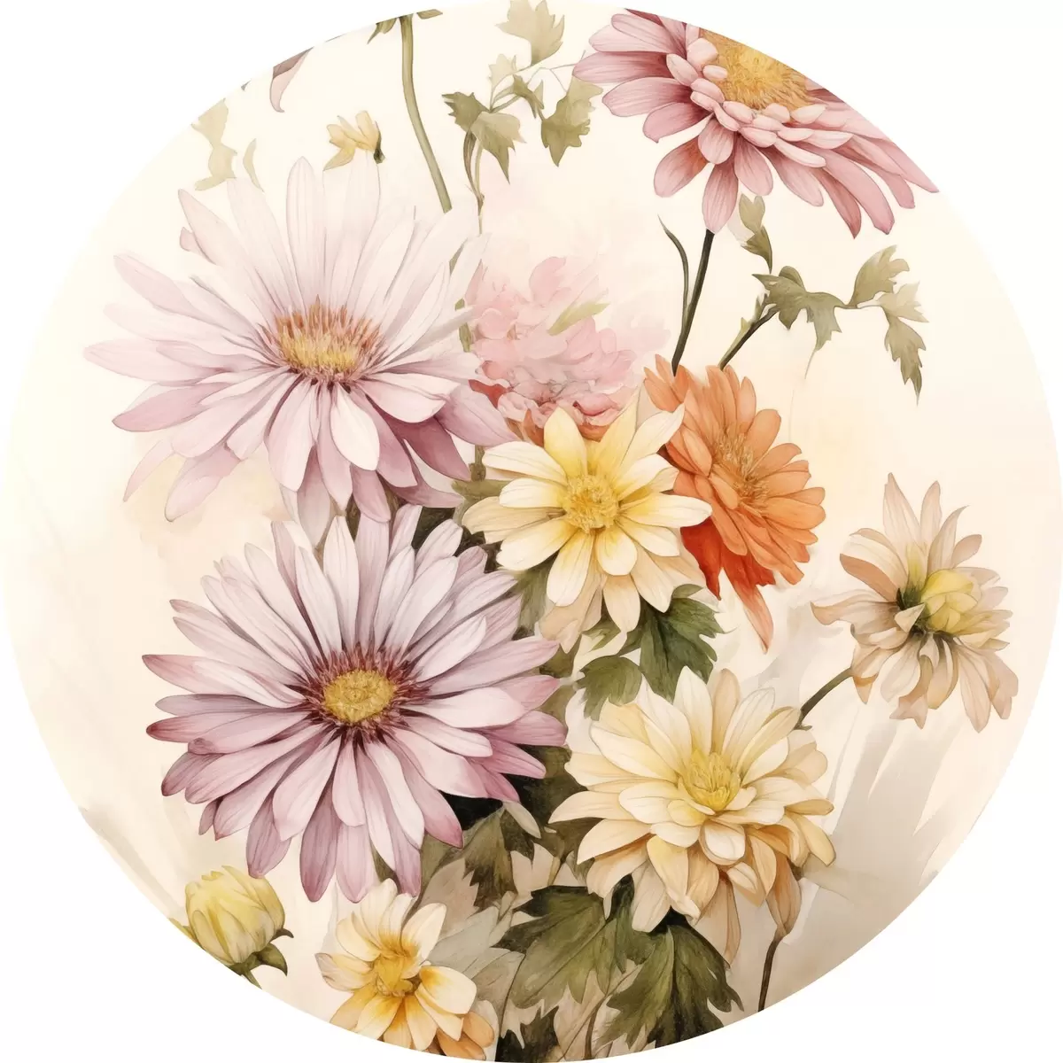 Runde Gemälde Ein Blumenstrauß aus bunten Blumen, weiche Aquarell-Stil, auf einem hellen Hintergrund r45559