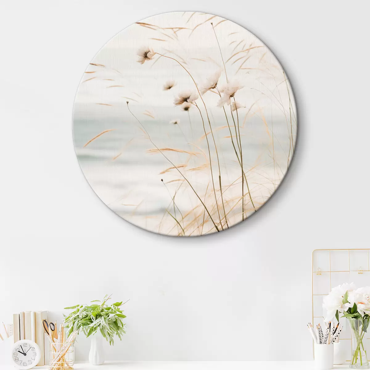 Runde Gemälde Etwas Baumwollgras und anderes trockenes Gras vor einem verschwommenen Meer, weiche und gedämpfte Farbpalette r45562