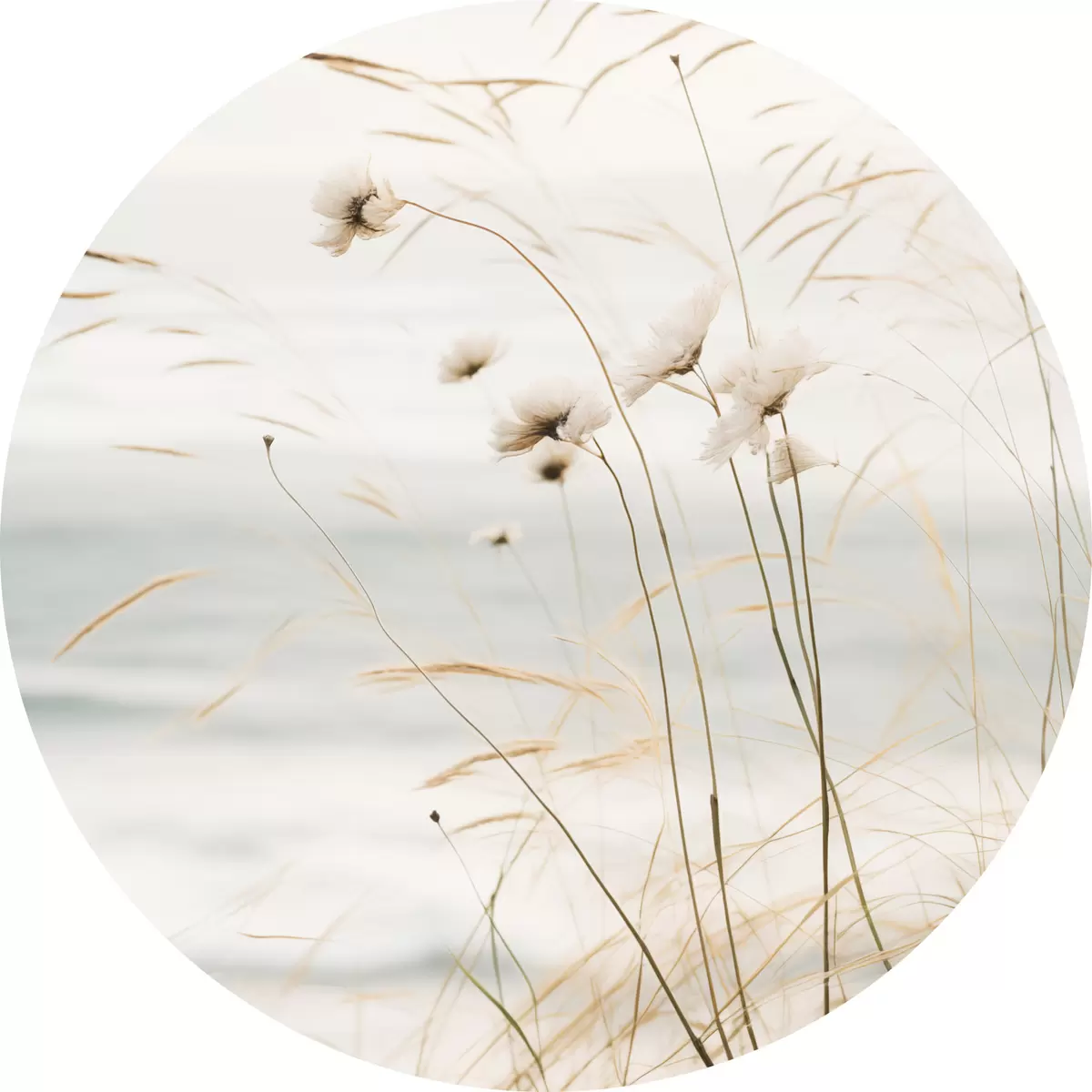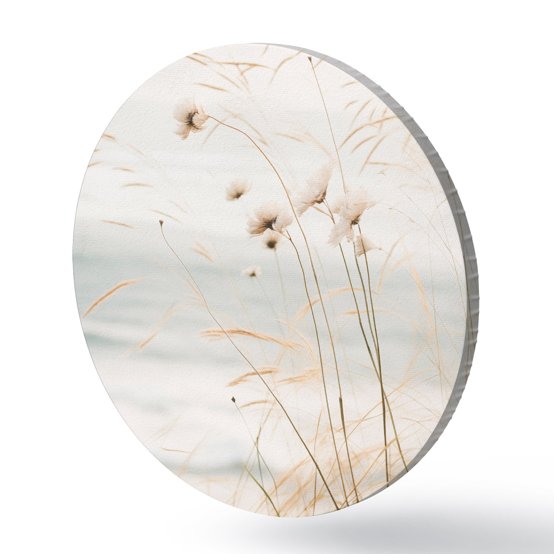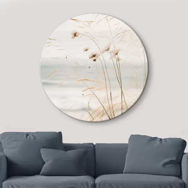 Runde Gemälde Etwas Baumwollgras und anderes trockenes Gras vor einem verschwommenen Meer, weiche und gedämpfte Farbpalette r45562