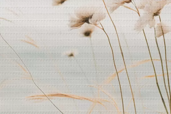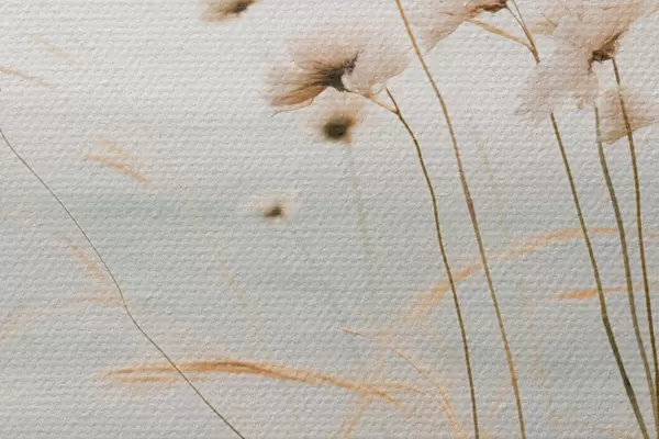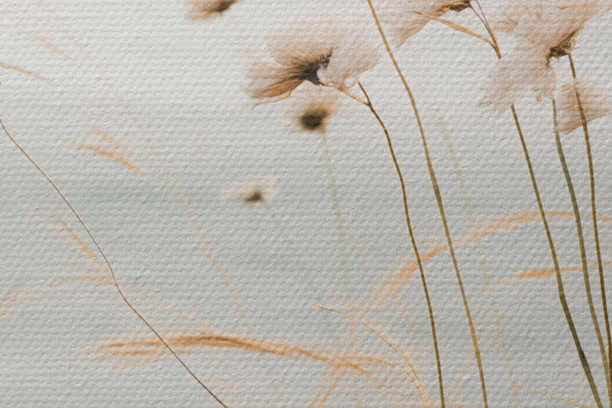 Bild Etwas Baumwollgras und anderes trockenes Gras vor einem verschwommenen Meer, weiche und gedämpfte Farbpalette Nr r45562