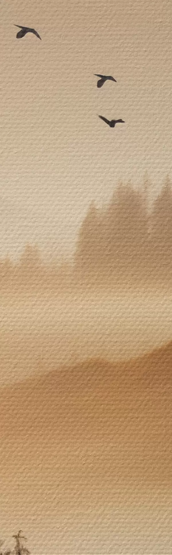Bild Eine Berglandschaft mit einem Wald und Vögeln fliegen in den Himmel, alle in einer dicken Schicht von Nebel während des Sonnenaufgangs bedeckt Nr r45563