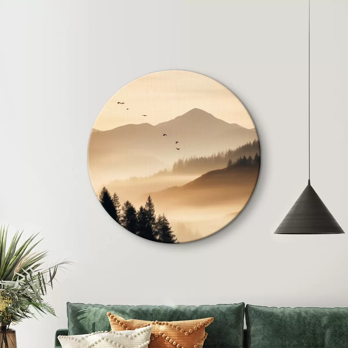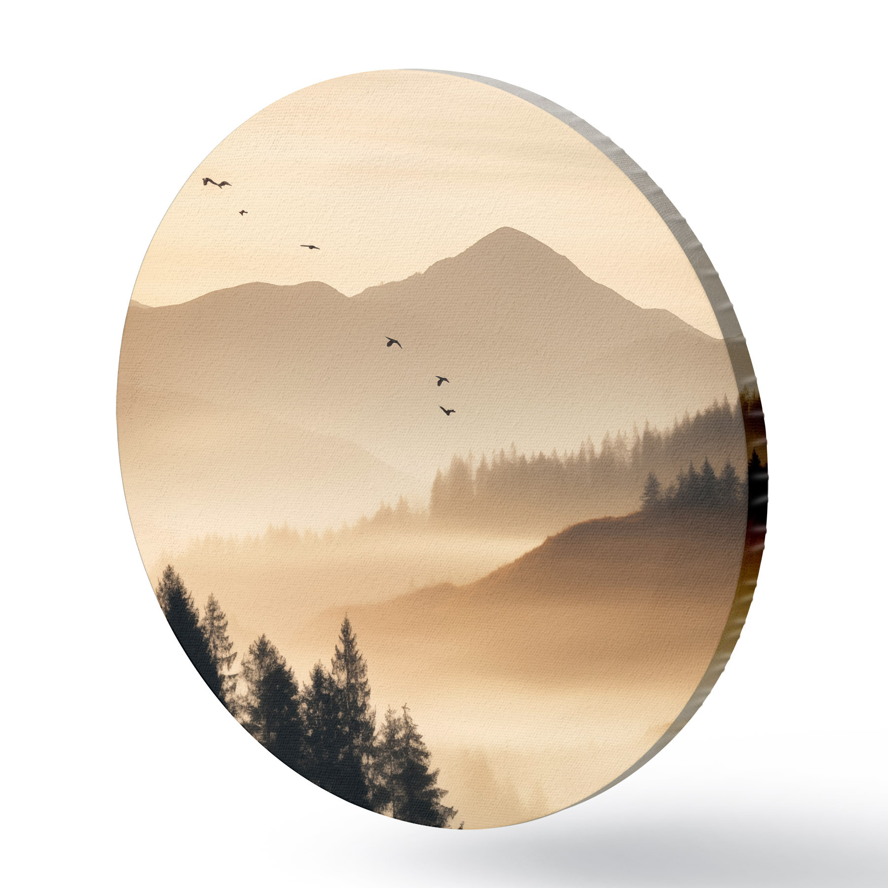 Runde Gemälde Eine Berglandschaft mit einem Wald und Vögeln fliegen in den Himmel, alle in einer dicken Schicht von Nebel während des Sonnenaufgangs bedeckt r45563