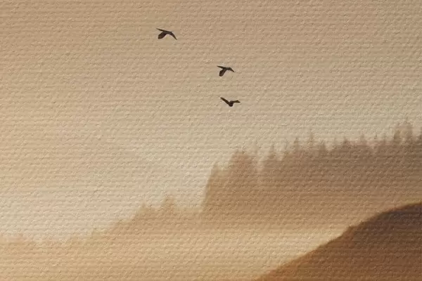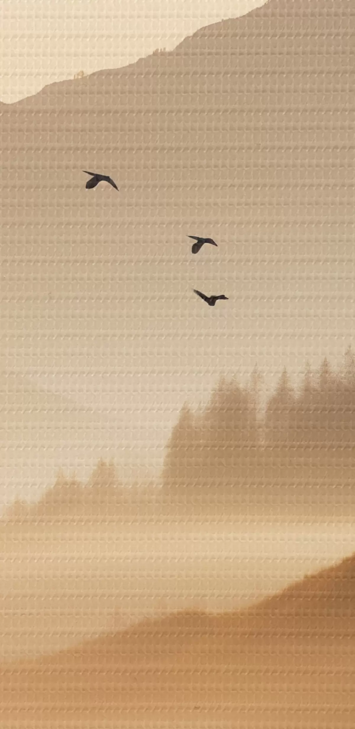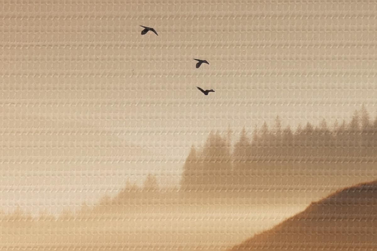 Bild Eine Berglandschaft mit einem Wald und Vögeln fliegen in den Himmel, alle in einer dicken Schicht von Nebel während des Sonnenaufgangs bedeckt Nr r45563