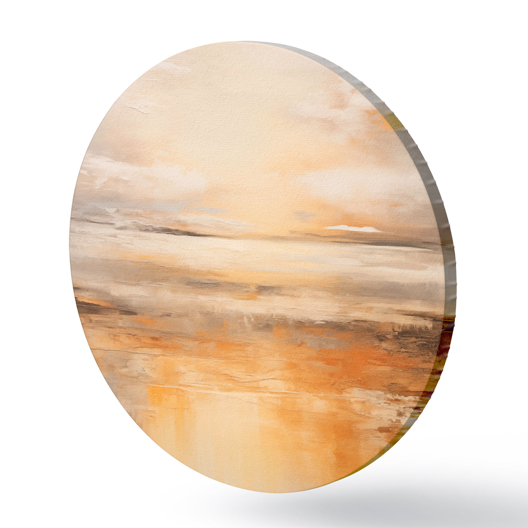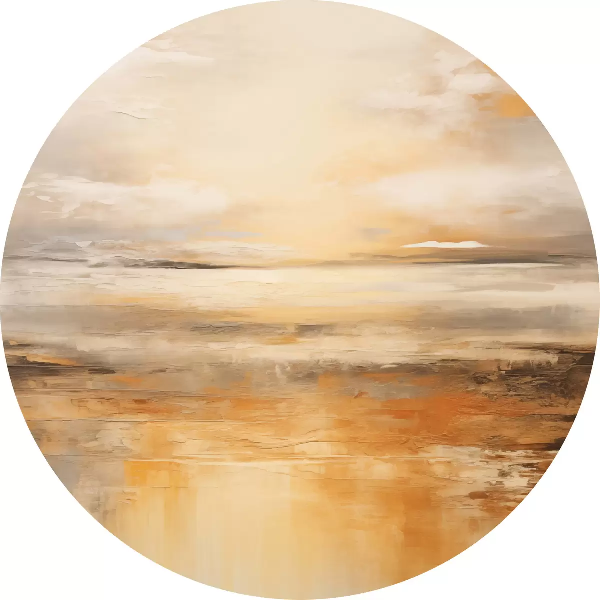 Runde Gemälde Ein abstraktes Gemälde von einer Strandlandschaft mit einem ruhigen Meer, orangefarbenem Sand und einem bewölkten Himmel mit Sonne r45567