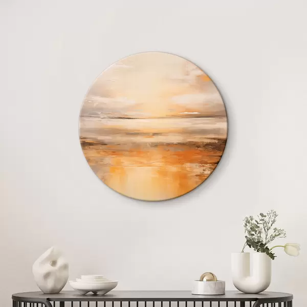Runde Gemälde Ein abstraktes Gemälde von einer Strandlandschaft mit einem ruhigen Meer, orangefarbenem Sand und einem bewölkten Himmel mit Sonne r45567