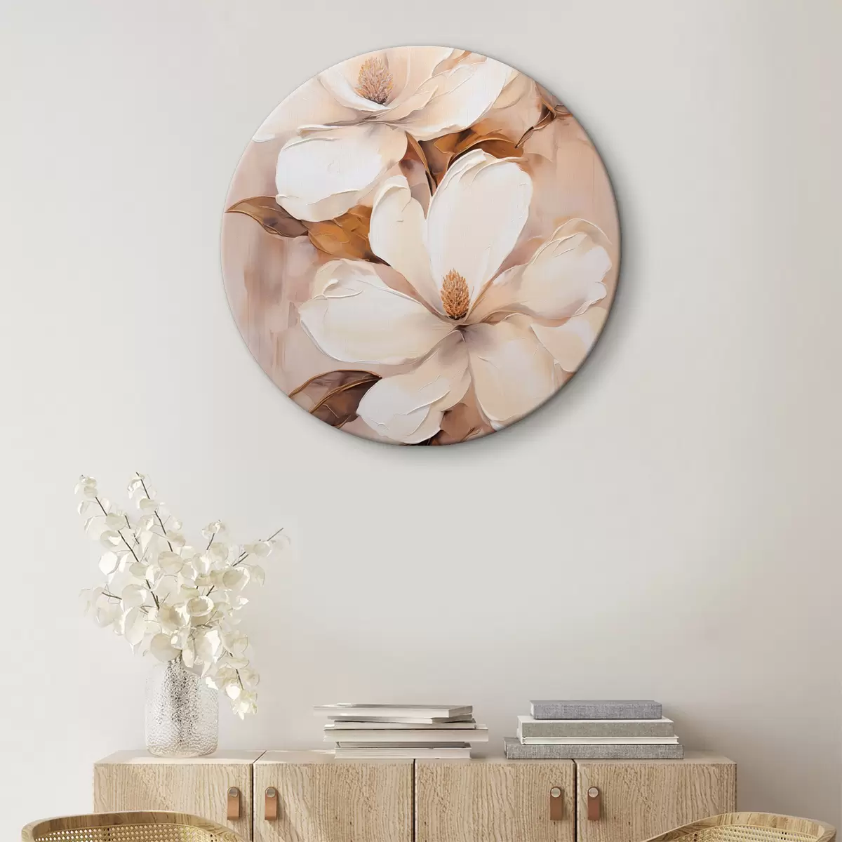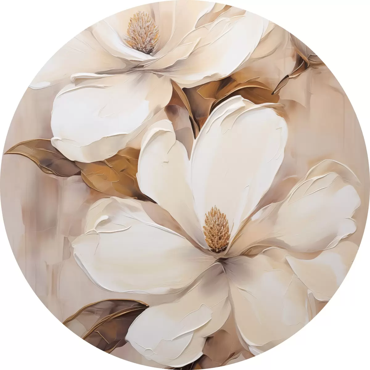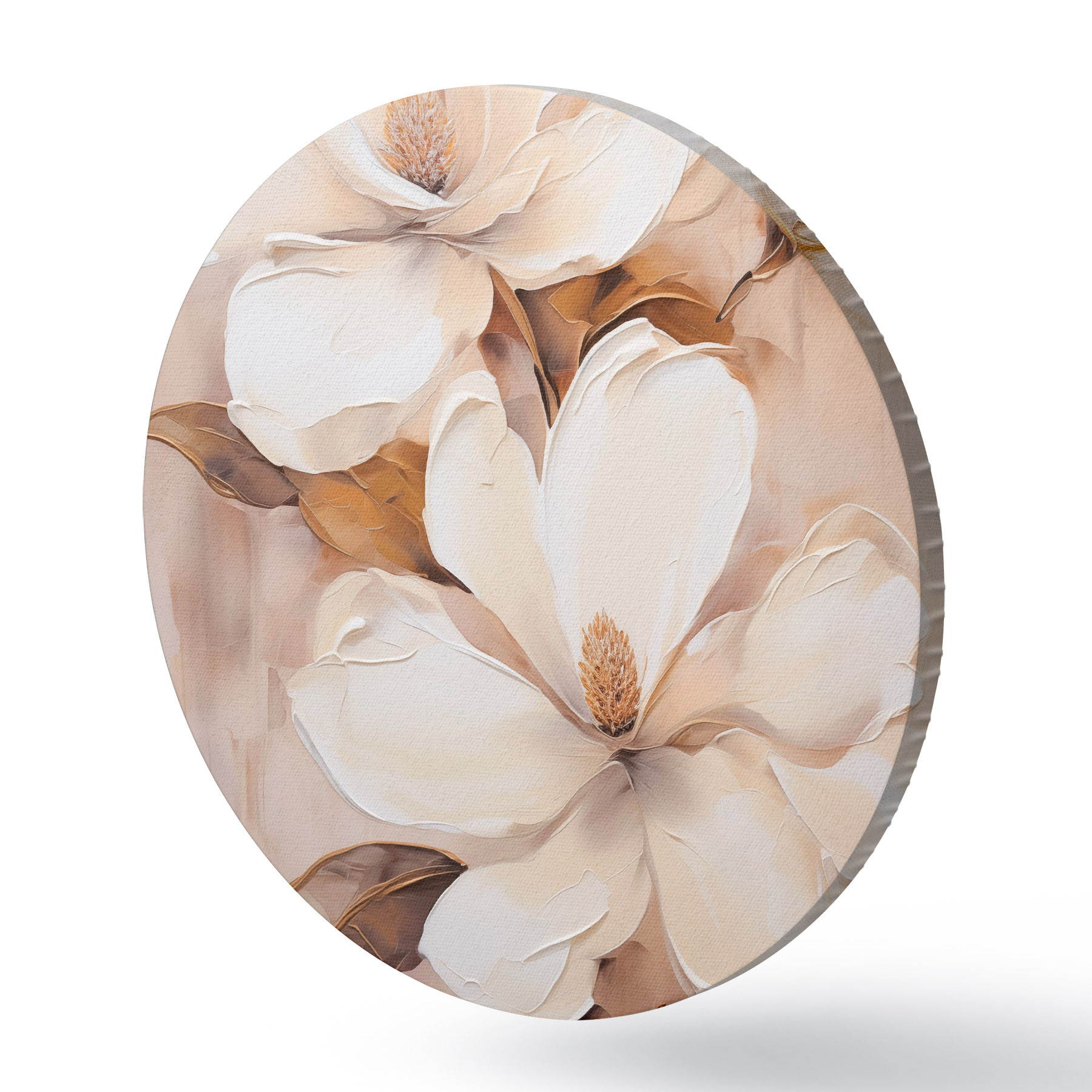 Runde Gemälde Weiße Magnolienblüten vor einem weichen, unscharfen Hintergrund aus Beige- und Brauntönen, Malstil r45572