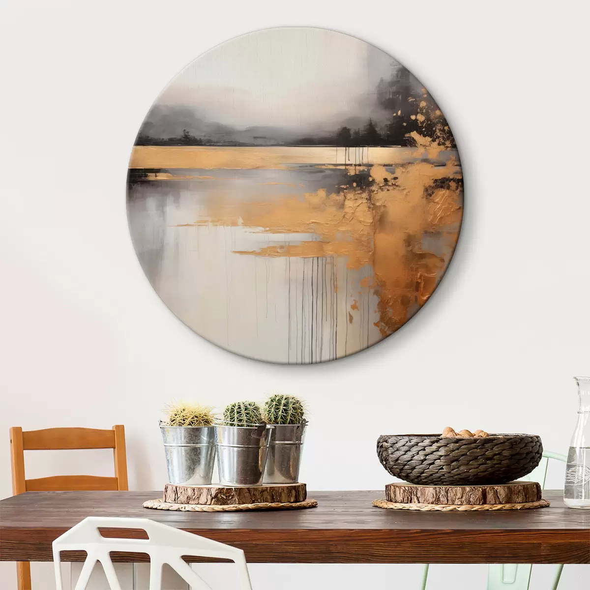 Runde Gemälde Abstrakte, strukturierte Landschaft mit einem Fluss und dunklen Bäumen im Hintergrund, der Himmel ist bewölkt r45576