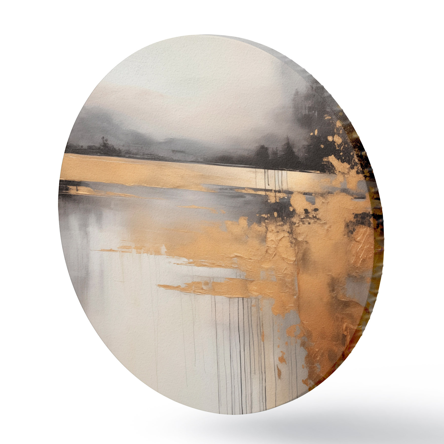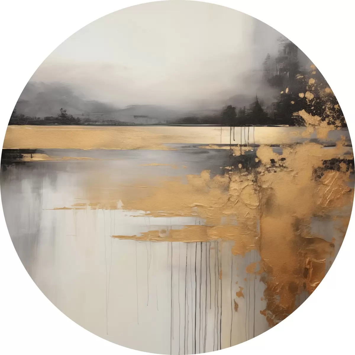 Runde Gemälde Abstrakte, strukturierte Landschaft mit einem Fluss und dunklen Bäumen im Hintergrund, der Himmel ist bewölkt r45576