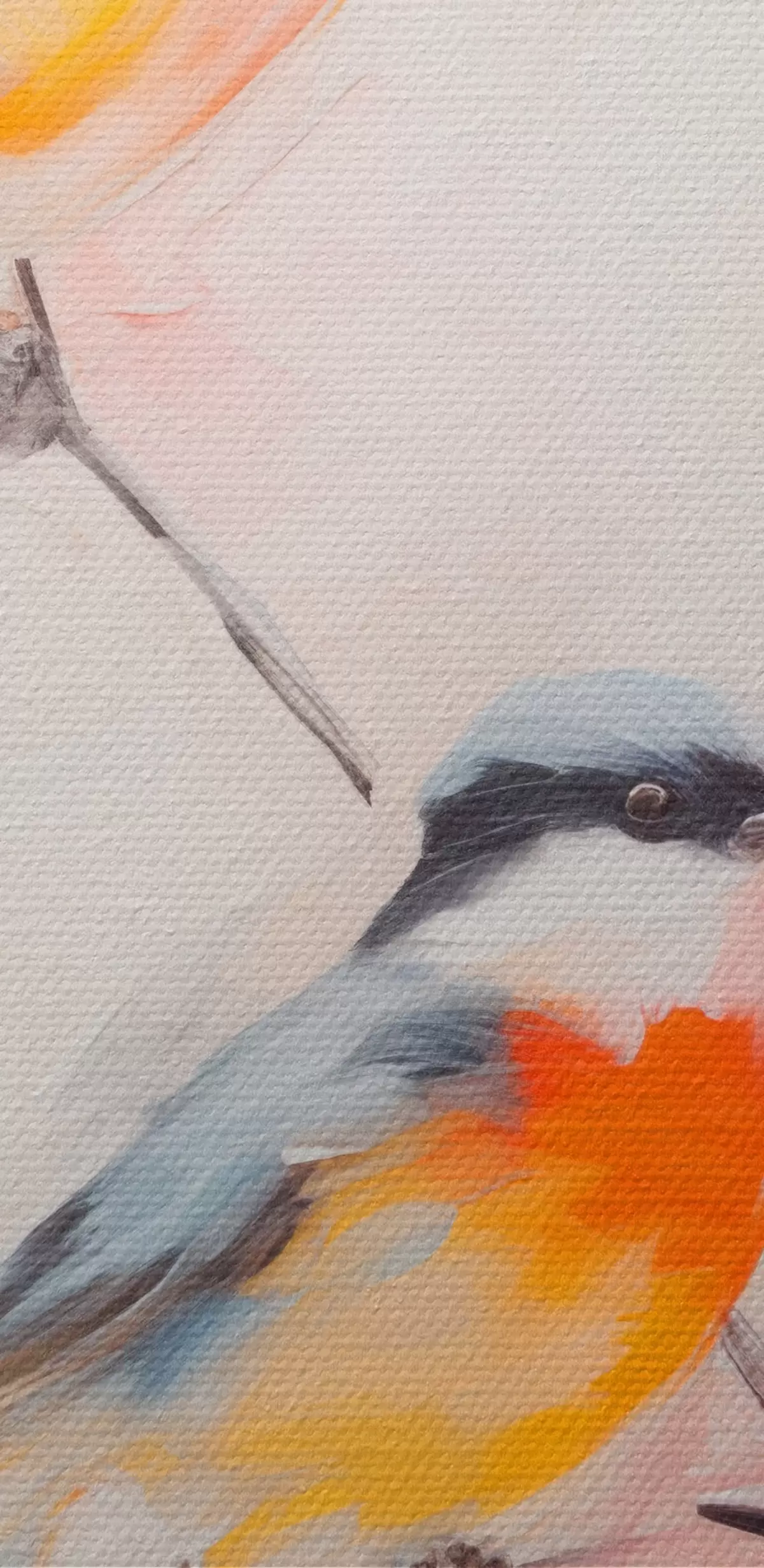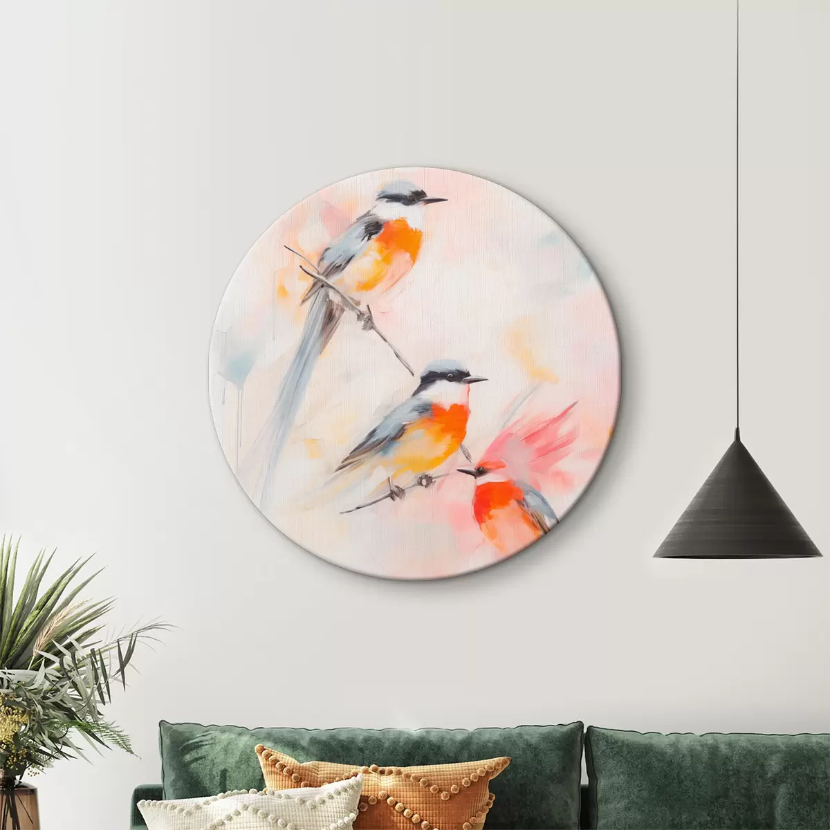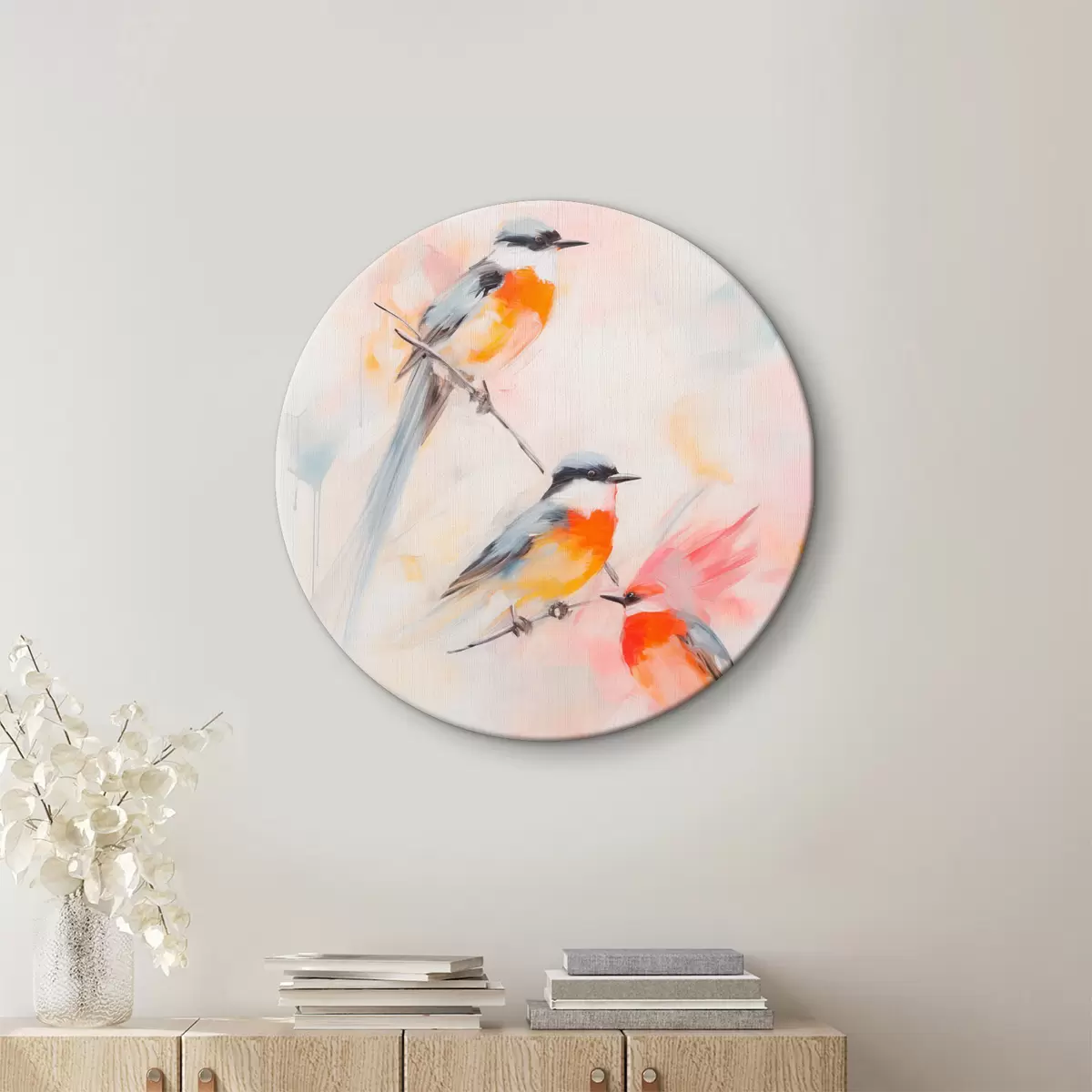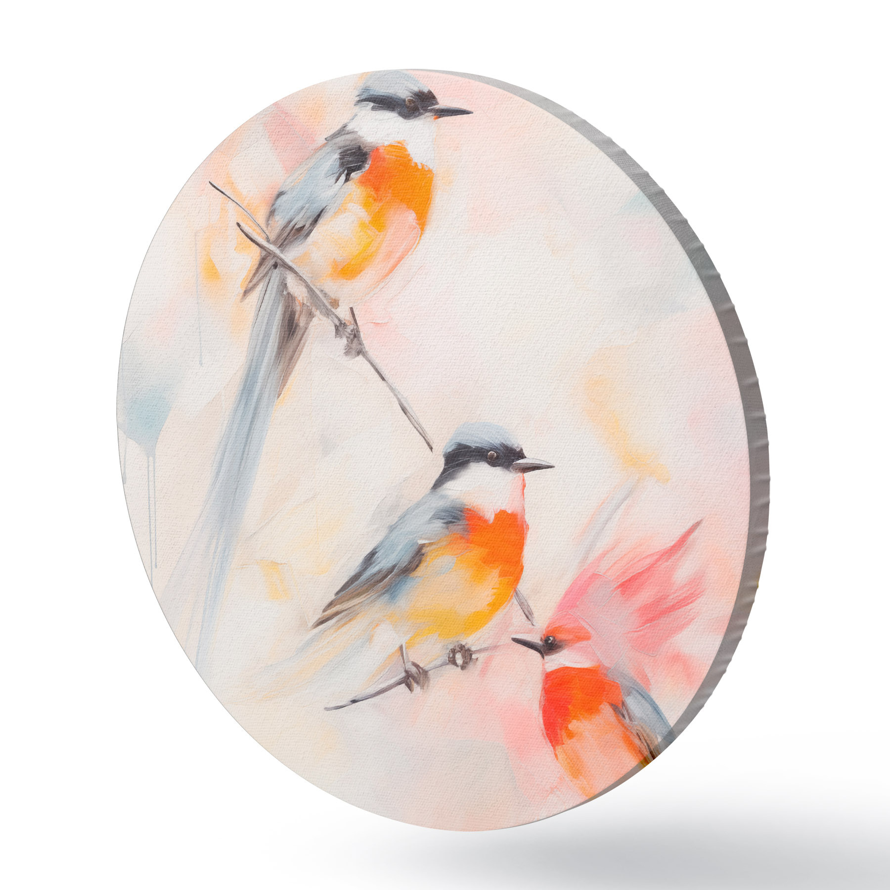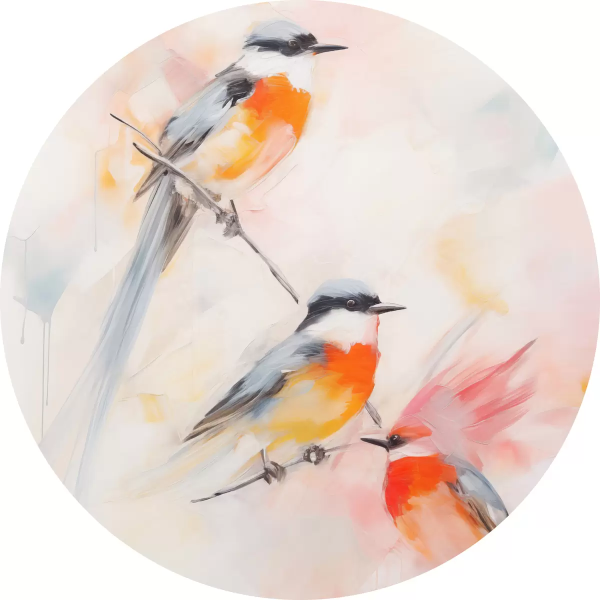 Runde Gemälde Vögel auf Zweigen, weiche Pastellfarben, heller Hintergrund mit rosa und weißen Farbtönen r45577