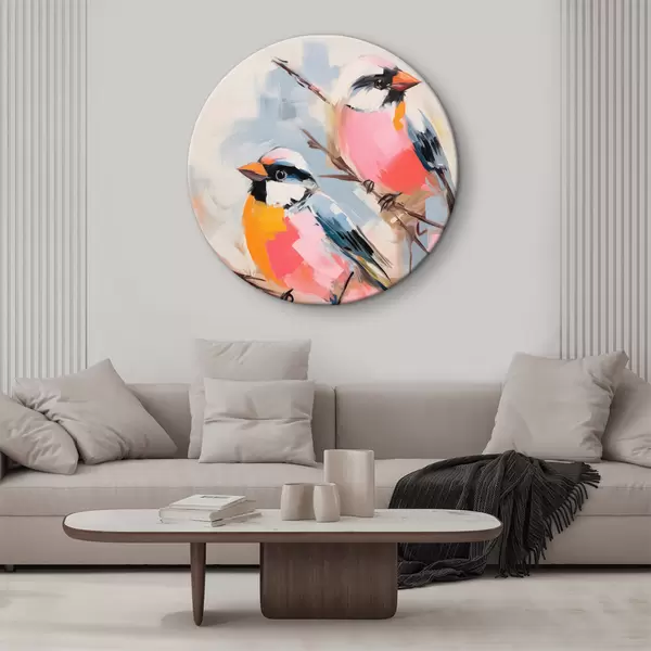 Runde Gemälde Bunte Vögel auf einem Zweig vor einem weichen pastellfarbenen Hintergrund r45578