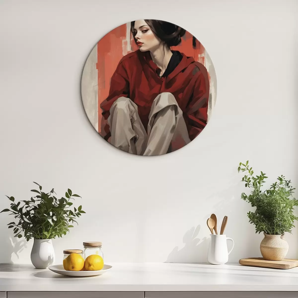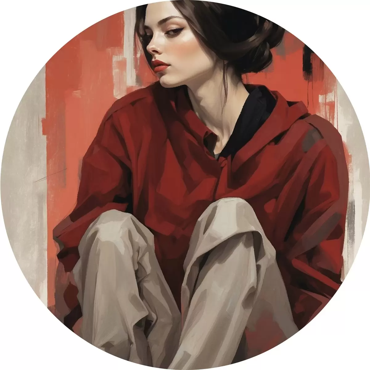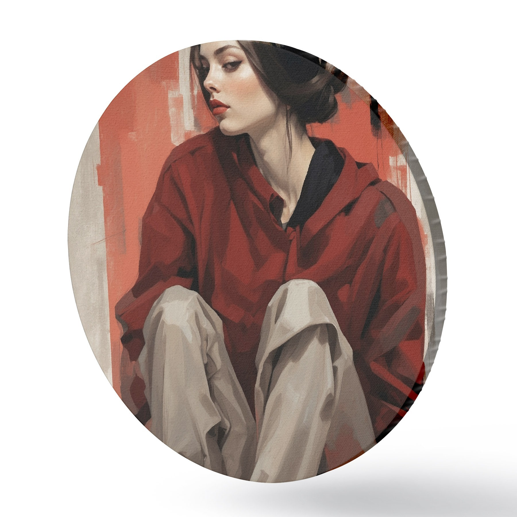 Runde Gemälde Mädchen in rotem Mantel sitzend mit verschränkten Beinen r45624
