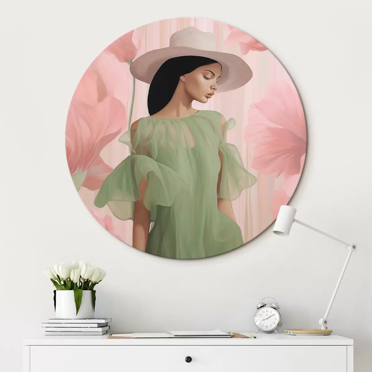 Runde Gemälde Mädchen mit Hut zwischen Blumen r45678