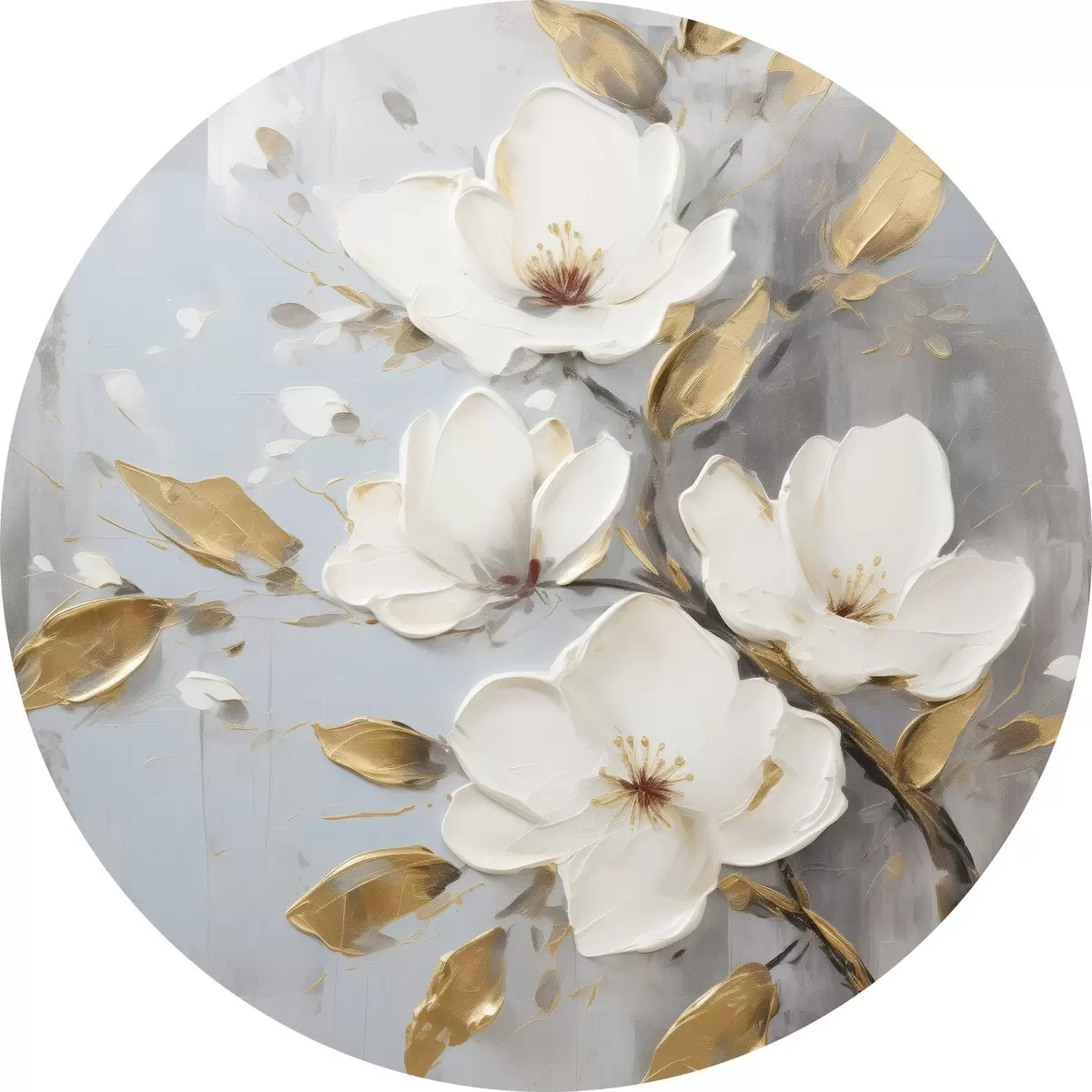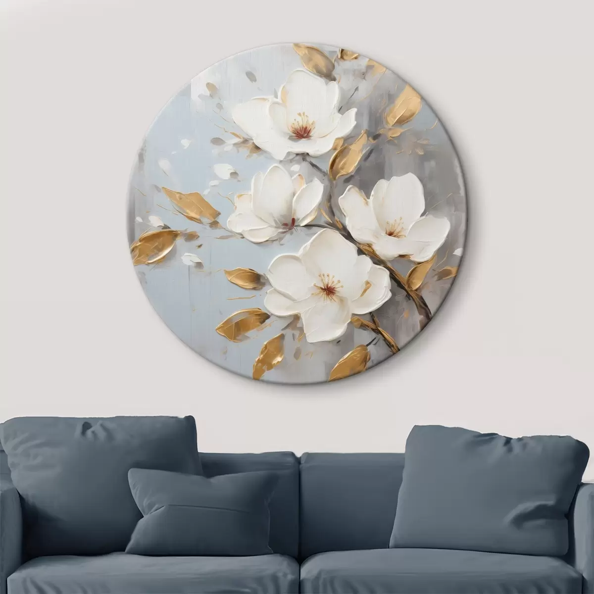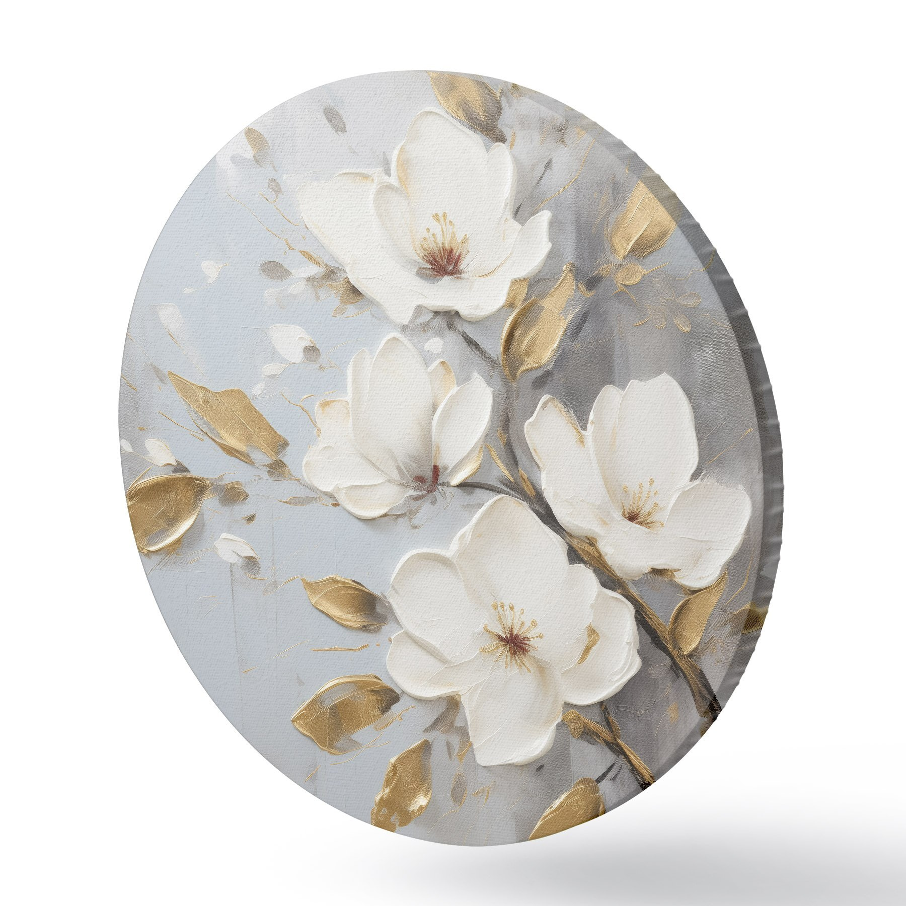 Runde Gemälde Zweig mit weißen Blüten und gelb-orangefarbenen Blättern r45692