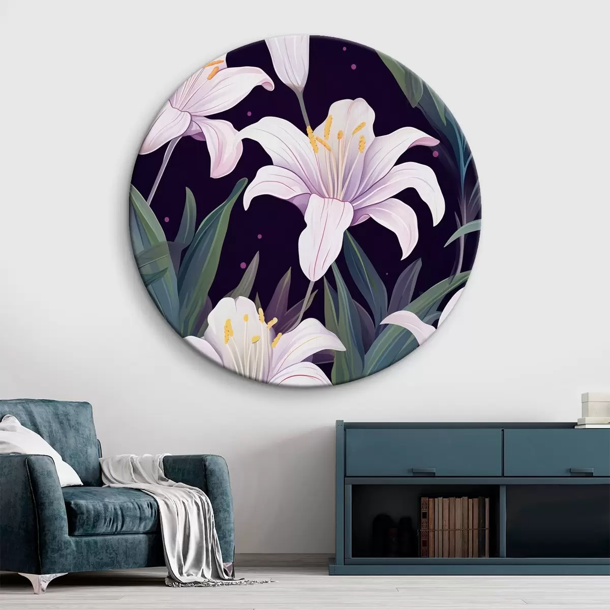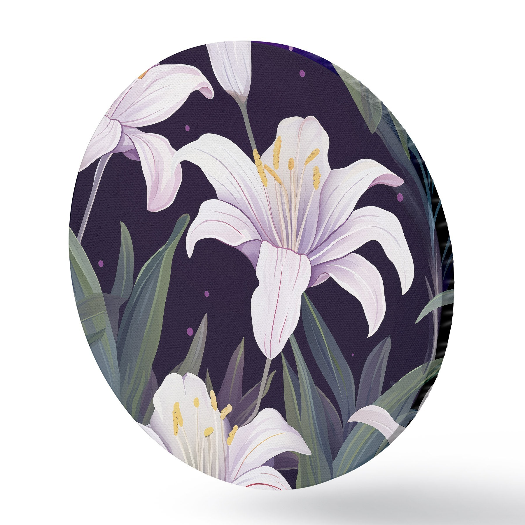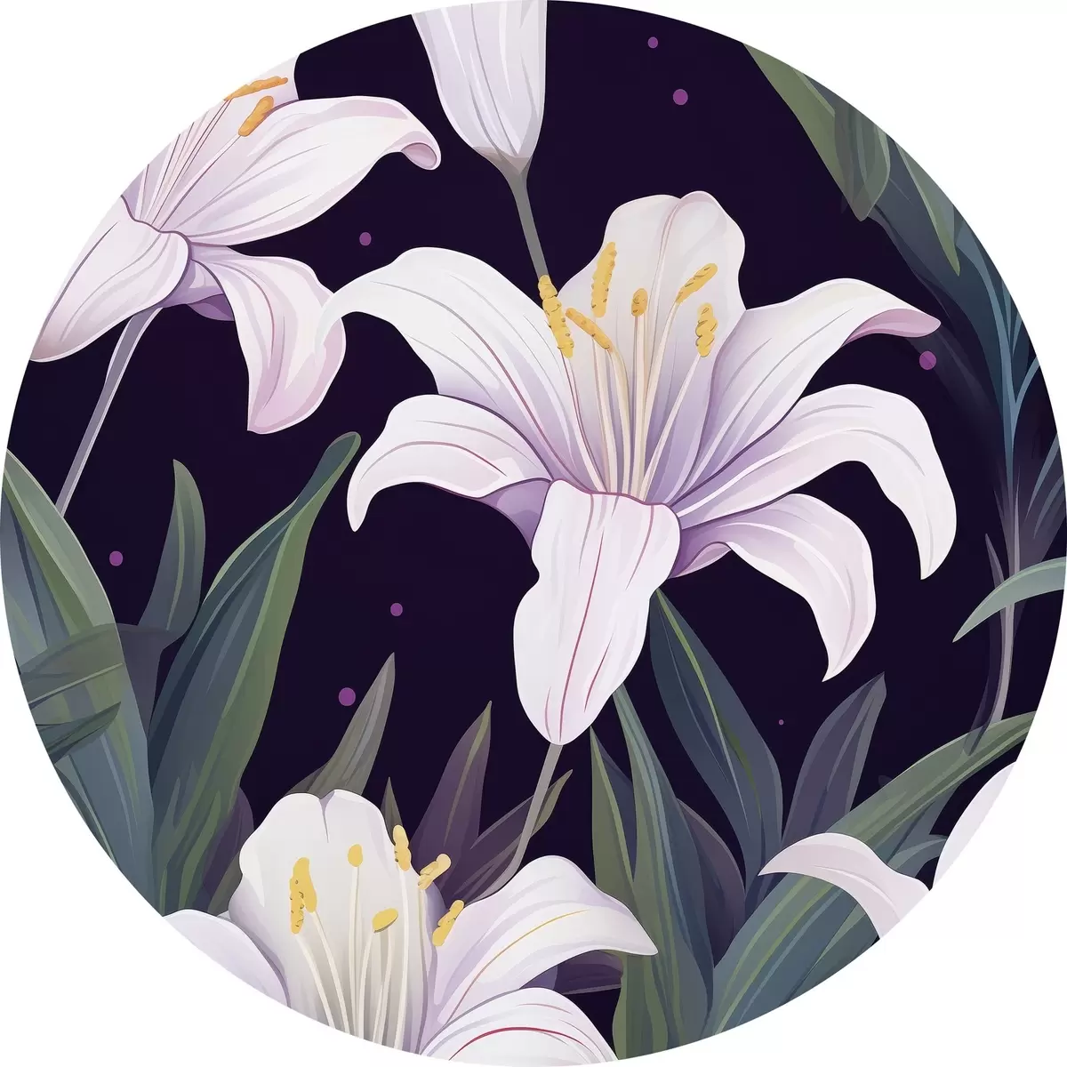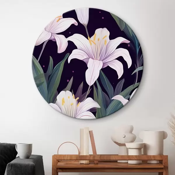 Runde Gemälde Zarte Lilien auf dunklem Hintergrund mit grünen Blättern r45697