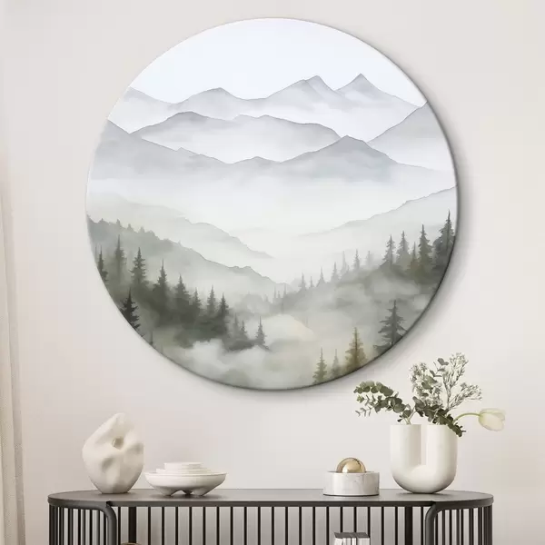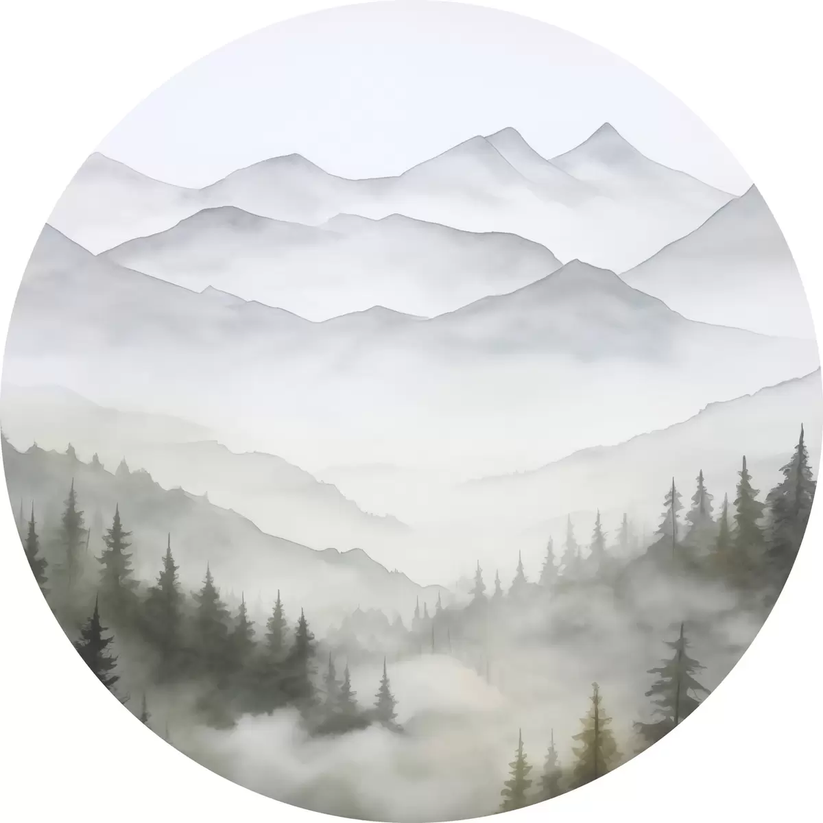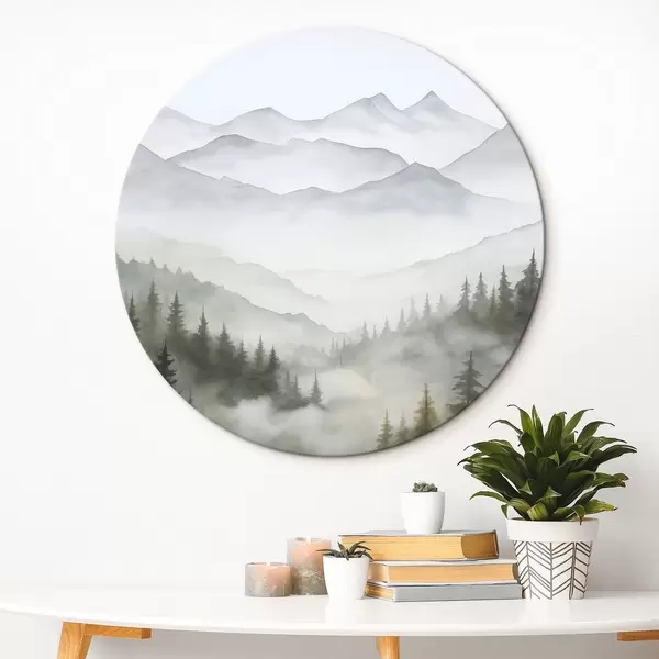 Runde Gemälde Wald im Nebel vor den Bergen r45774