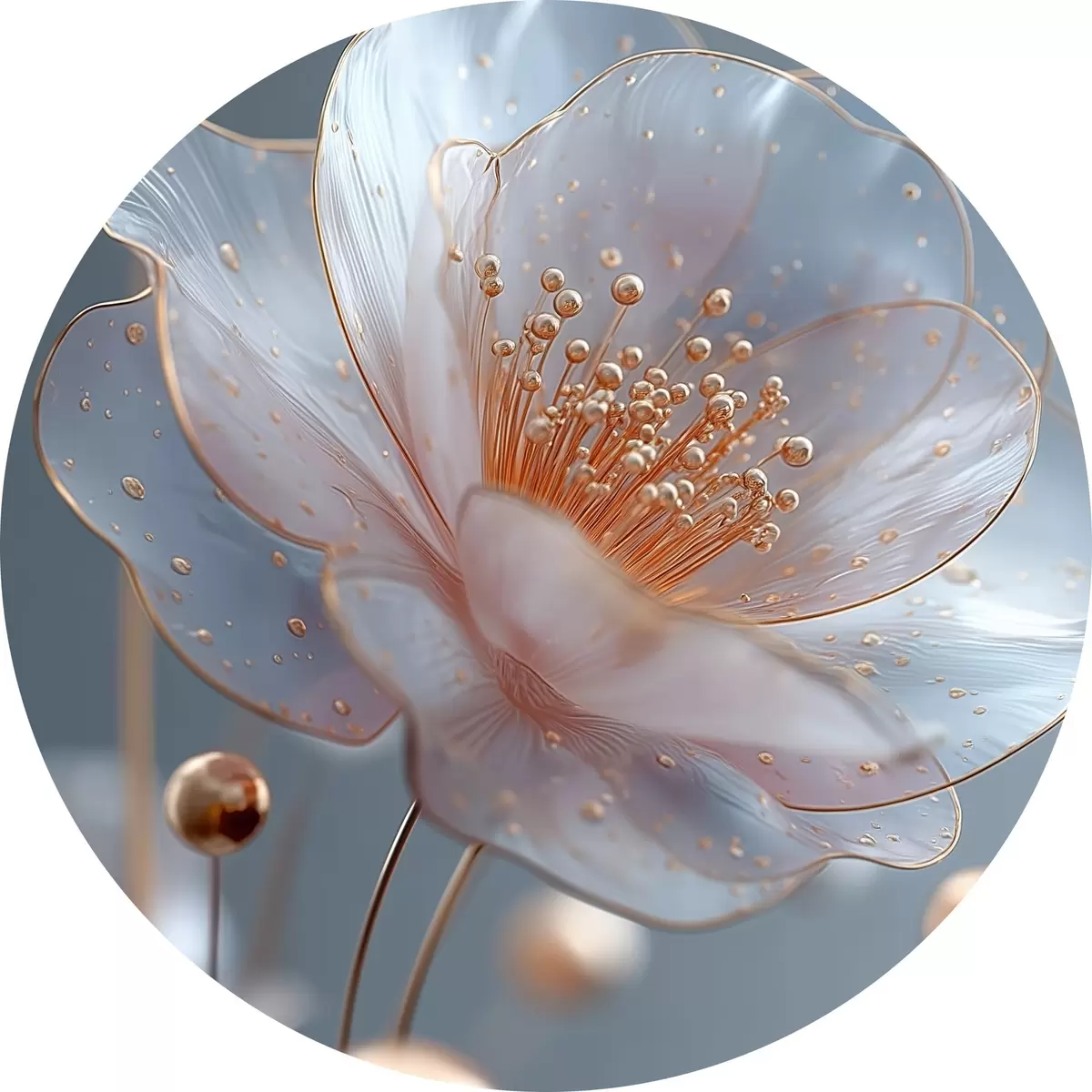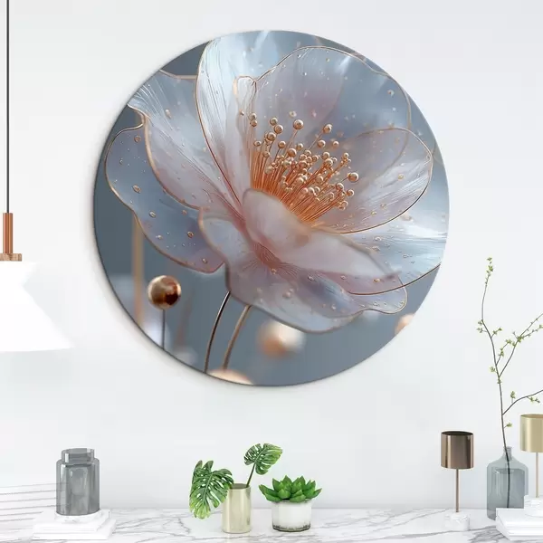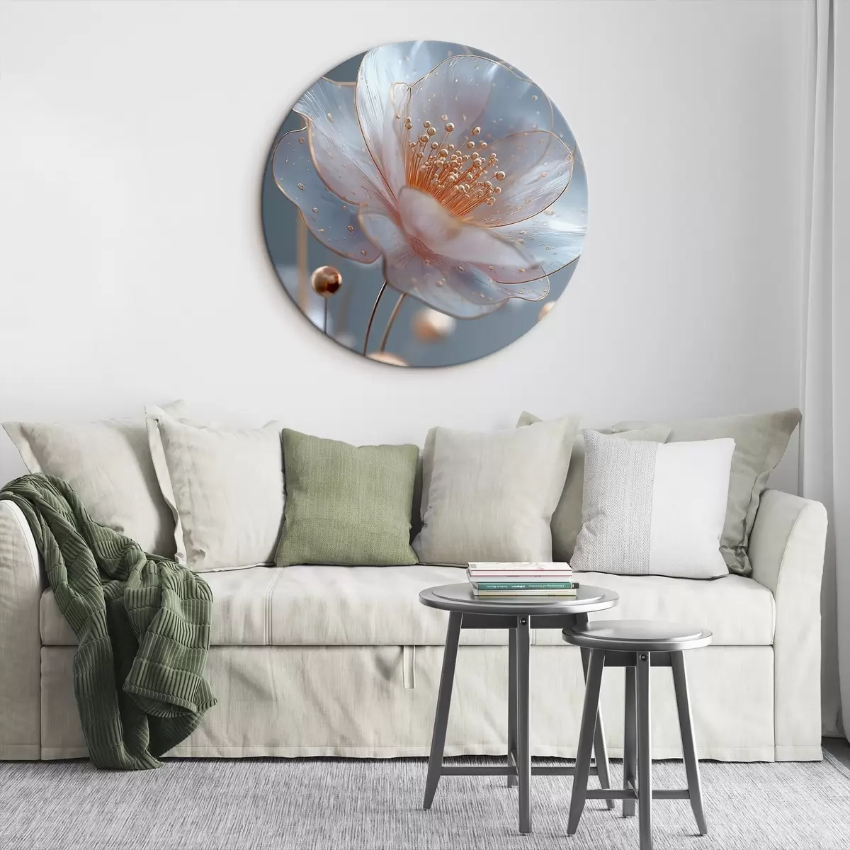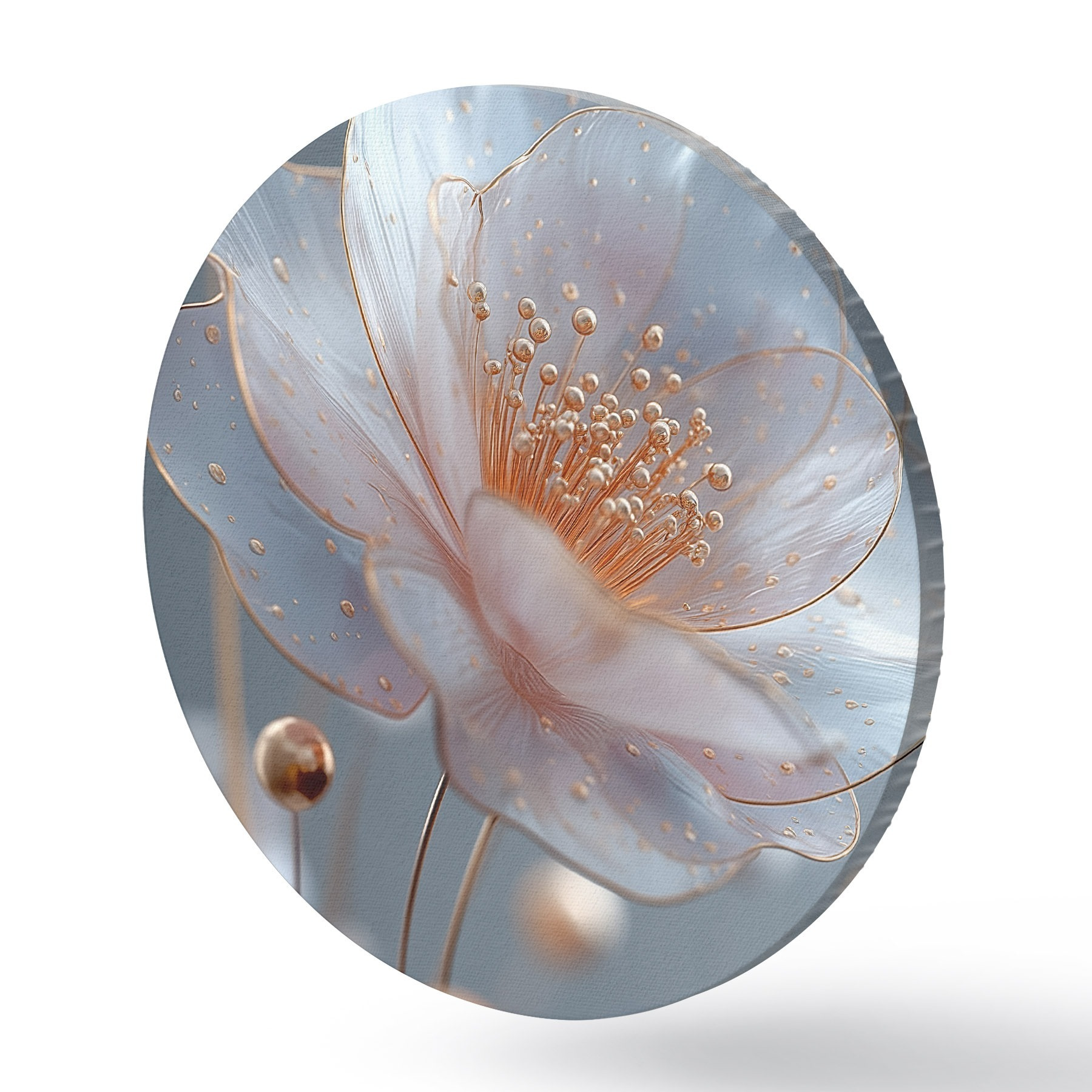 Runde Gemälde Durchscheinende Blume mit kupferfarbenen Staubblättern auf blauem Hintergrund r45880