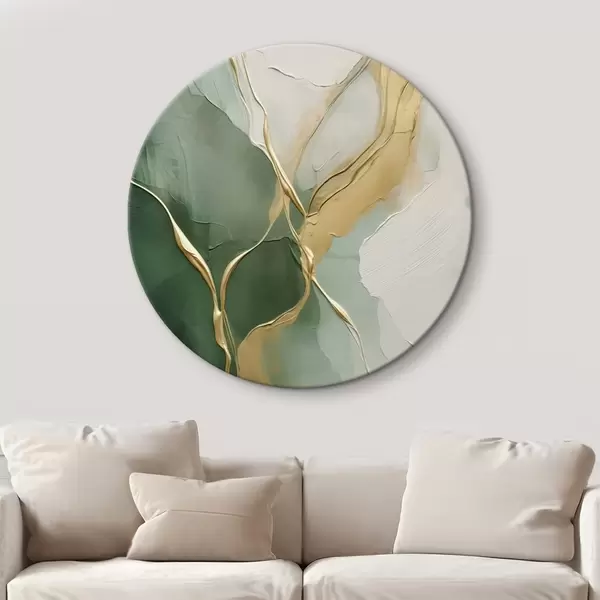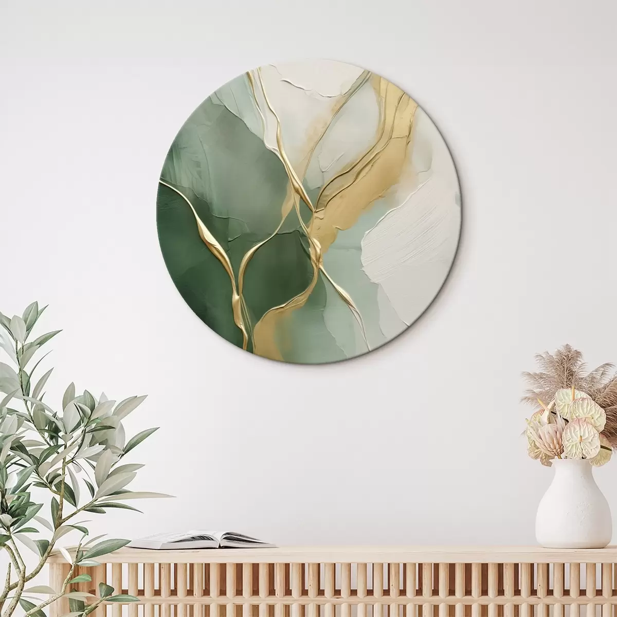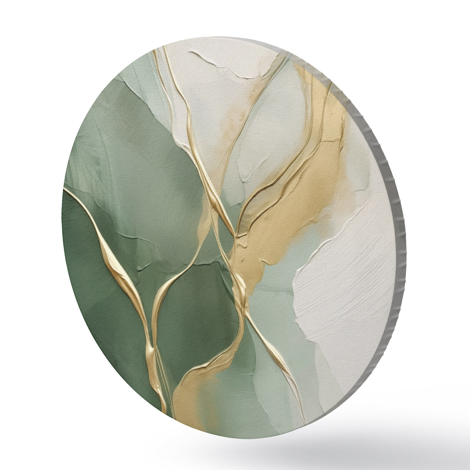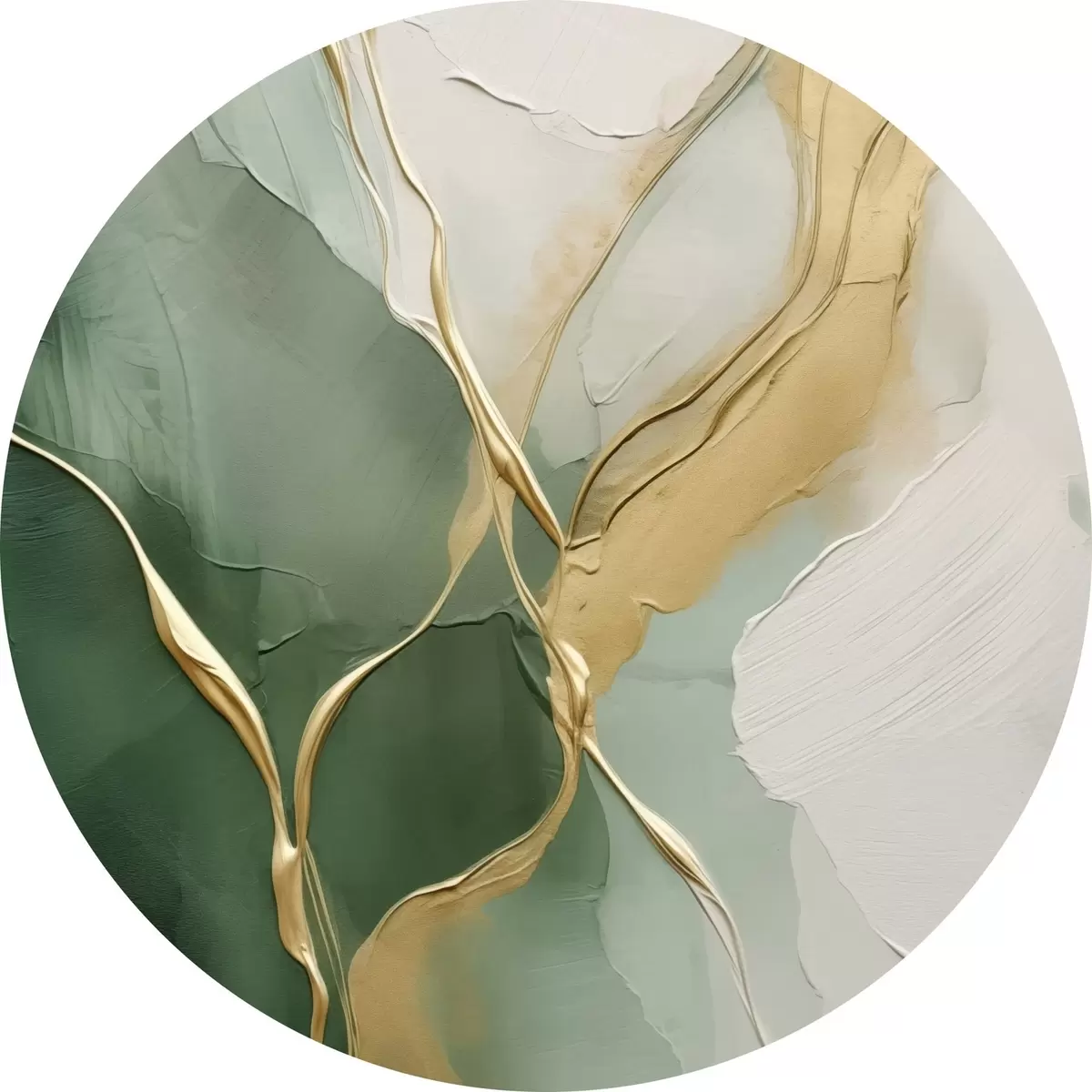 Runde Gemälde Smaragdgrün-cremefarbene Abstraktion mit gelben Rinnsalen r45887
