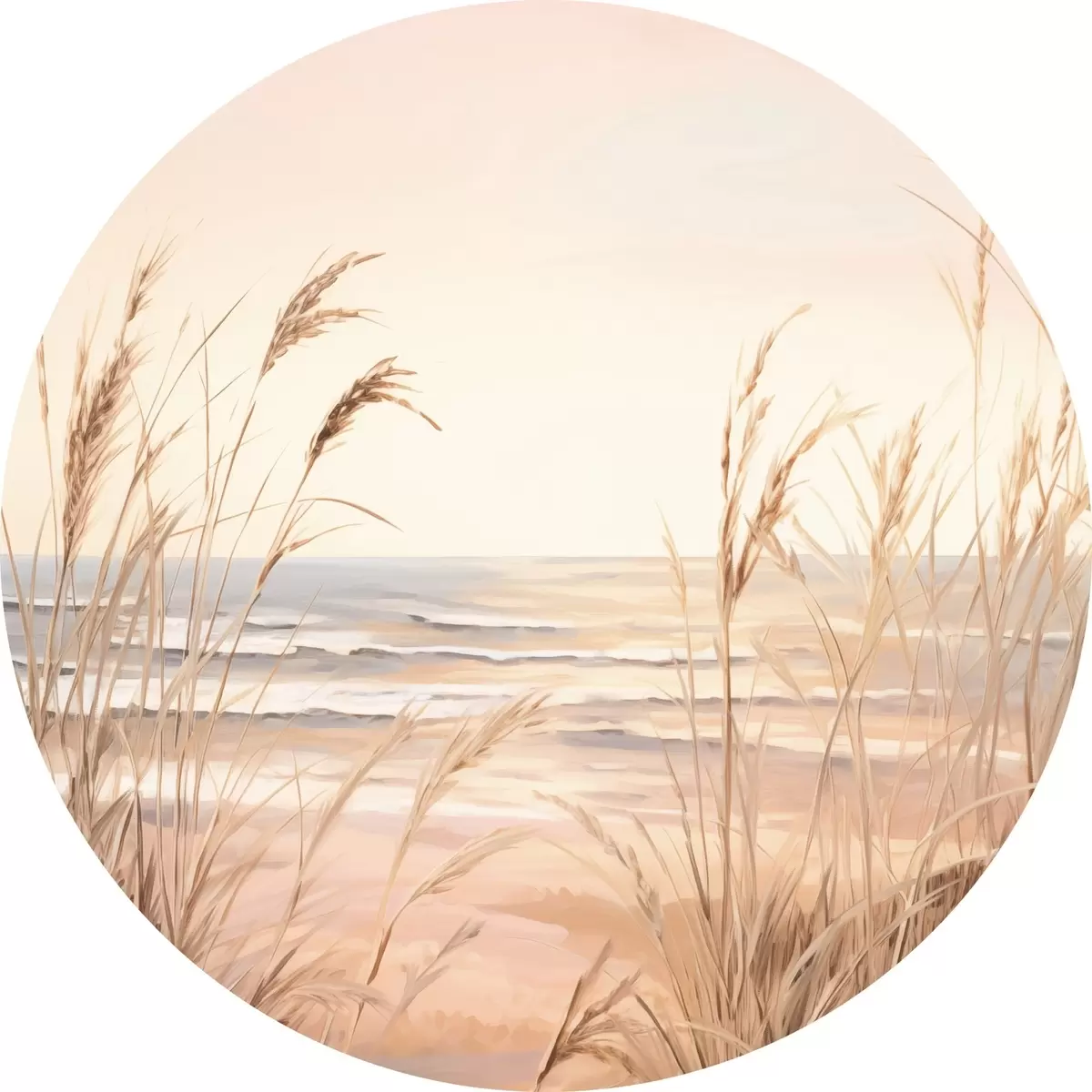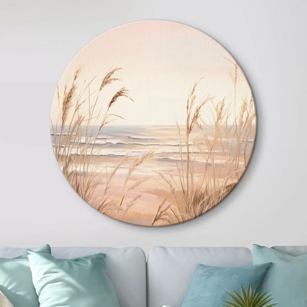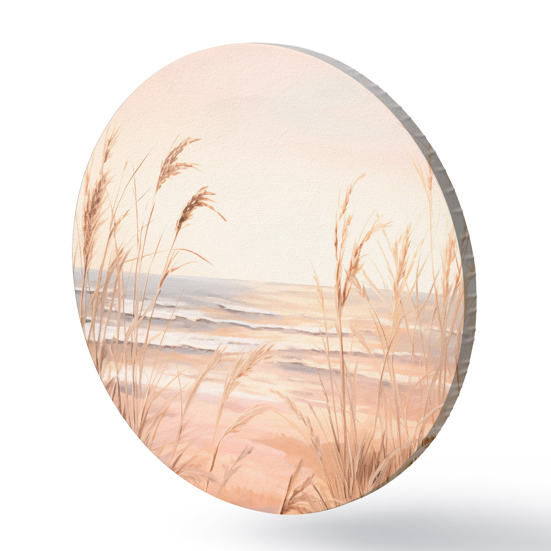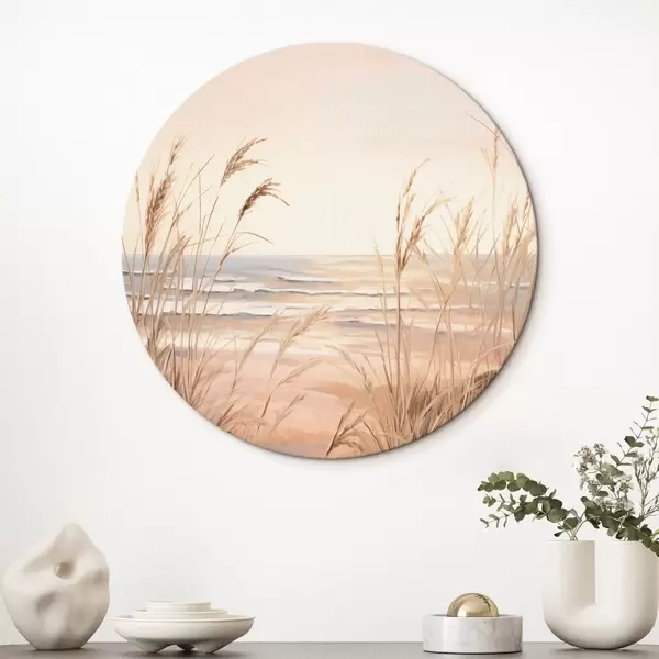 Runde Gemälde Pampasgras mit pastelloranger Farbpalette, hellrosa Himmel, eine ruhige Landschaft r45935