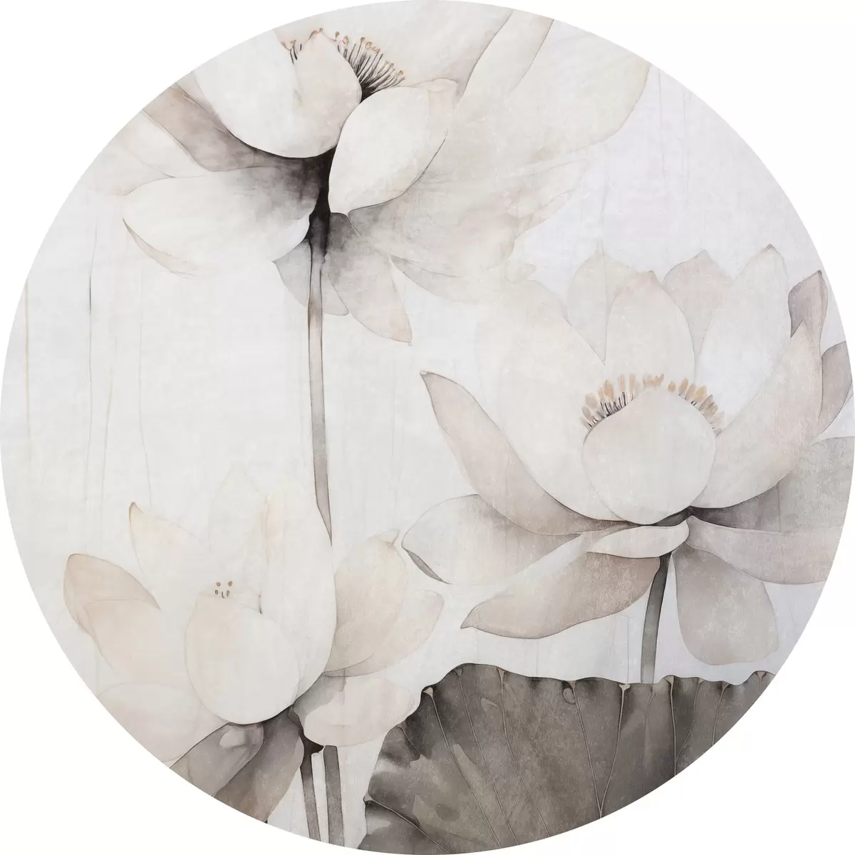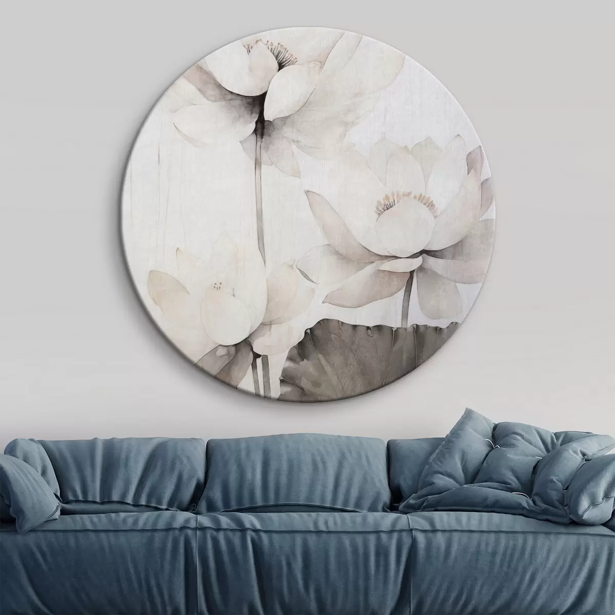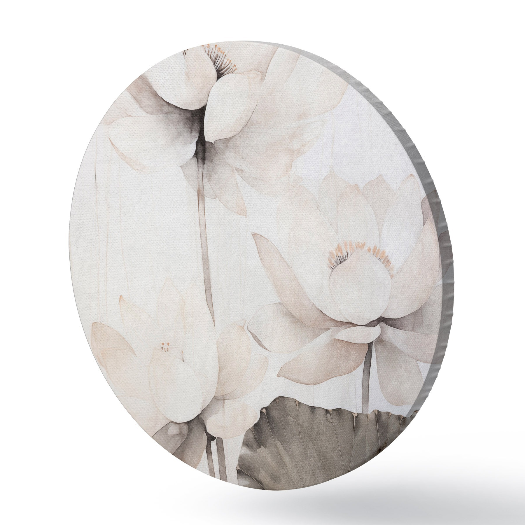 Runde Gemälde Weiße Lotusblumen mit dunkler Blattstruktur, heller Hintergrund, minimalistisches Design r45936