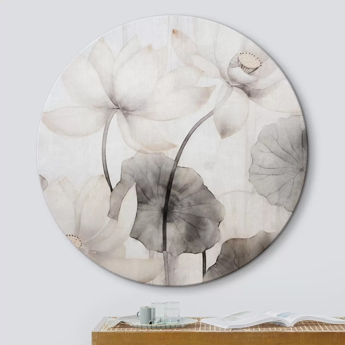 Runde Gemälde Weiße Lotusblumen mit dunkler Blattstruktur, heller Hintergrund, minimalistisches Design r45937