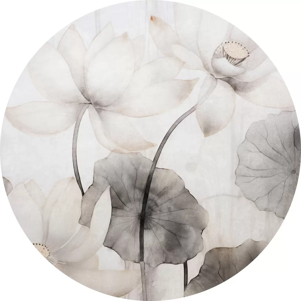 Runde Gemälde Weiße Lotusblumen mit dunkler Blattstruktur, heller Hintergrund, minimalistisches Design r45937