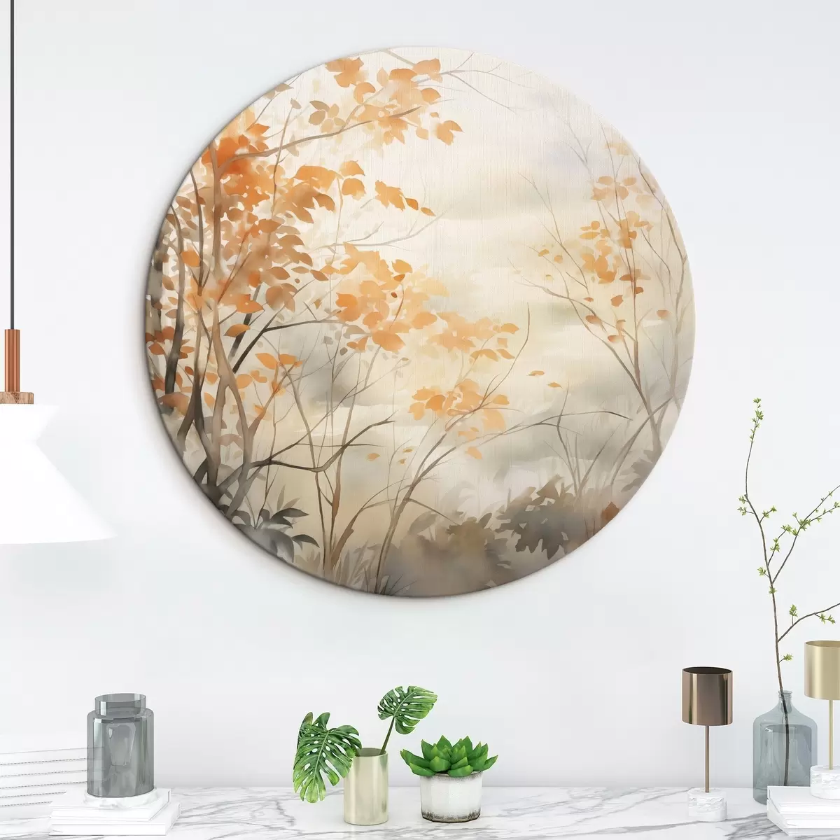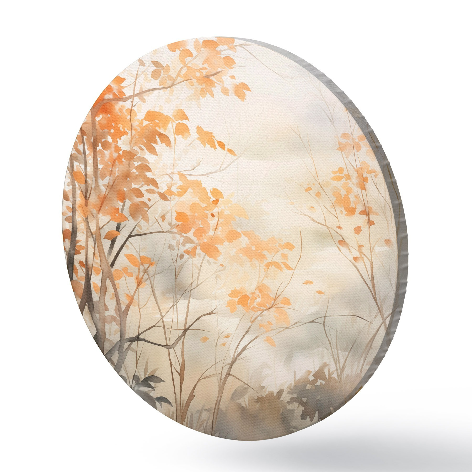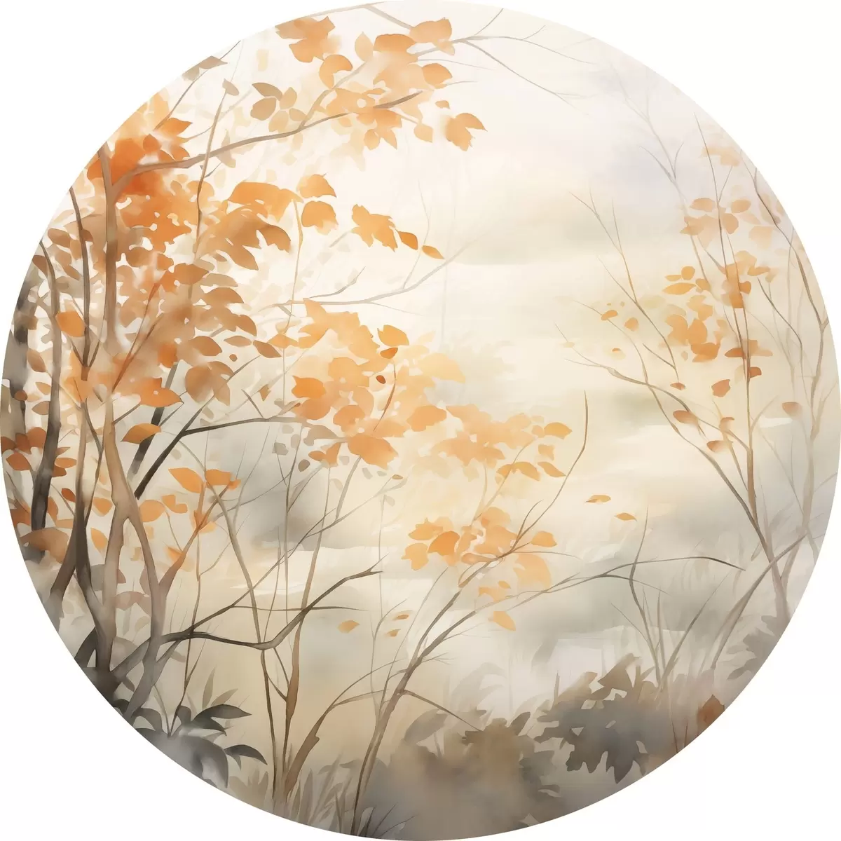 Runde Gemälde Herbstbäume mit orangefarbenen Blättern und Zweigen, sanfter Aquarellstil, zarte Pinselstriche r45941