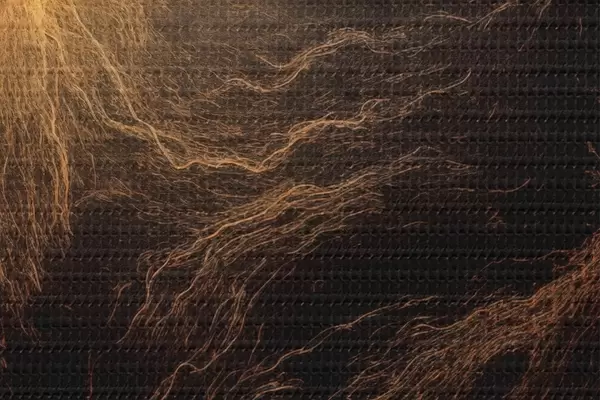 Bild Abstrakter Planet mit orangefarbenen Adern vor schwarzem Weltraumhintergrund, moderne minimalistische Kunst Nr r45943