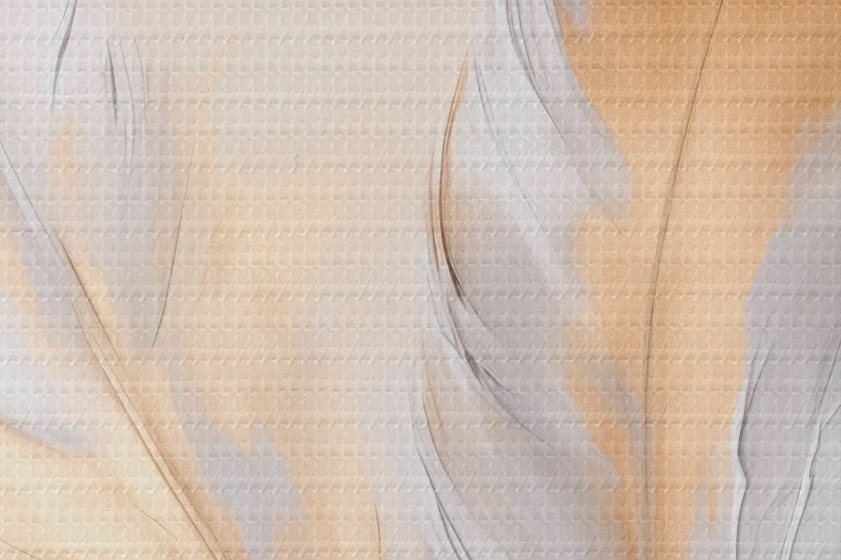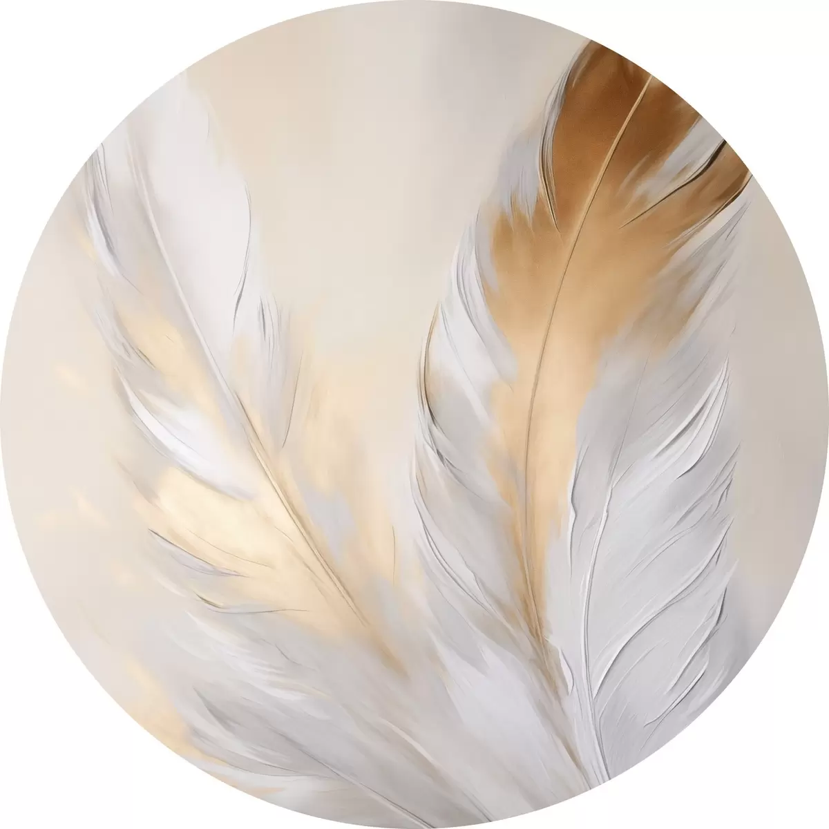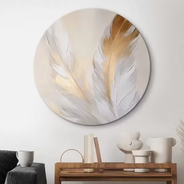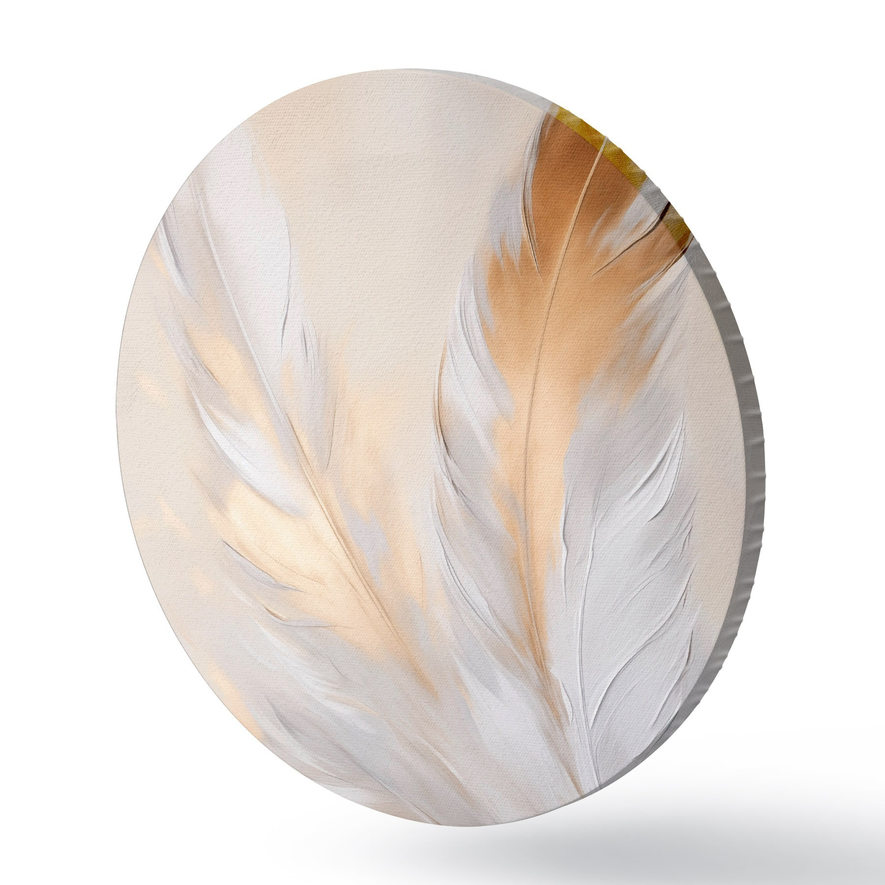 Runde Gemälde Federn mit orangefarbenen Akzenten, sanfte Beleuchtung, strukturierte minimalistische Komposition, moderne Kunst r45944