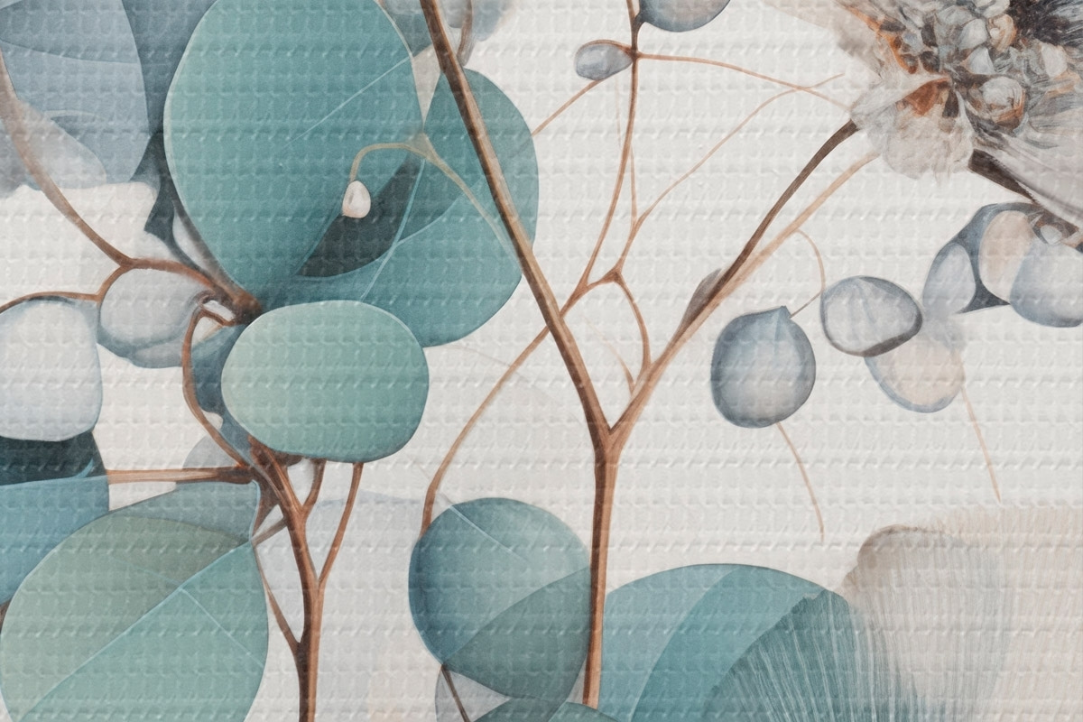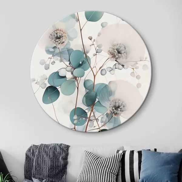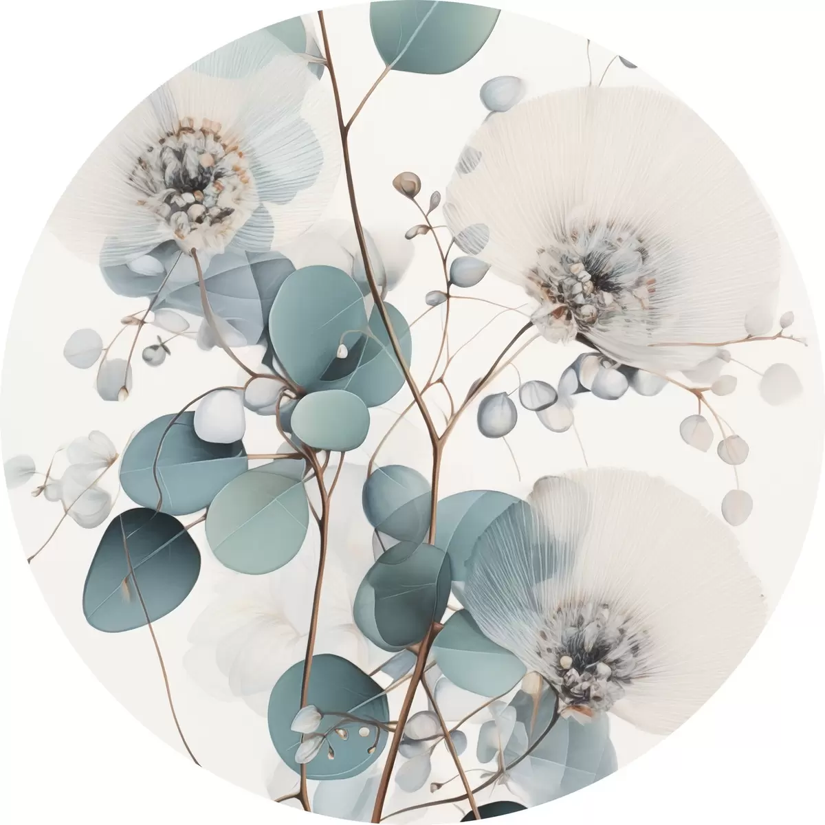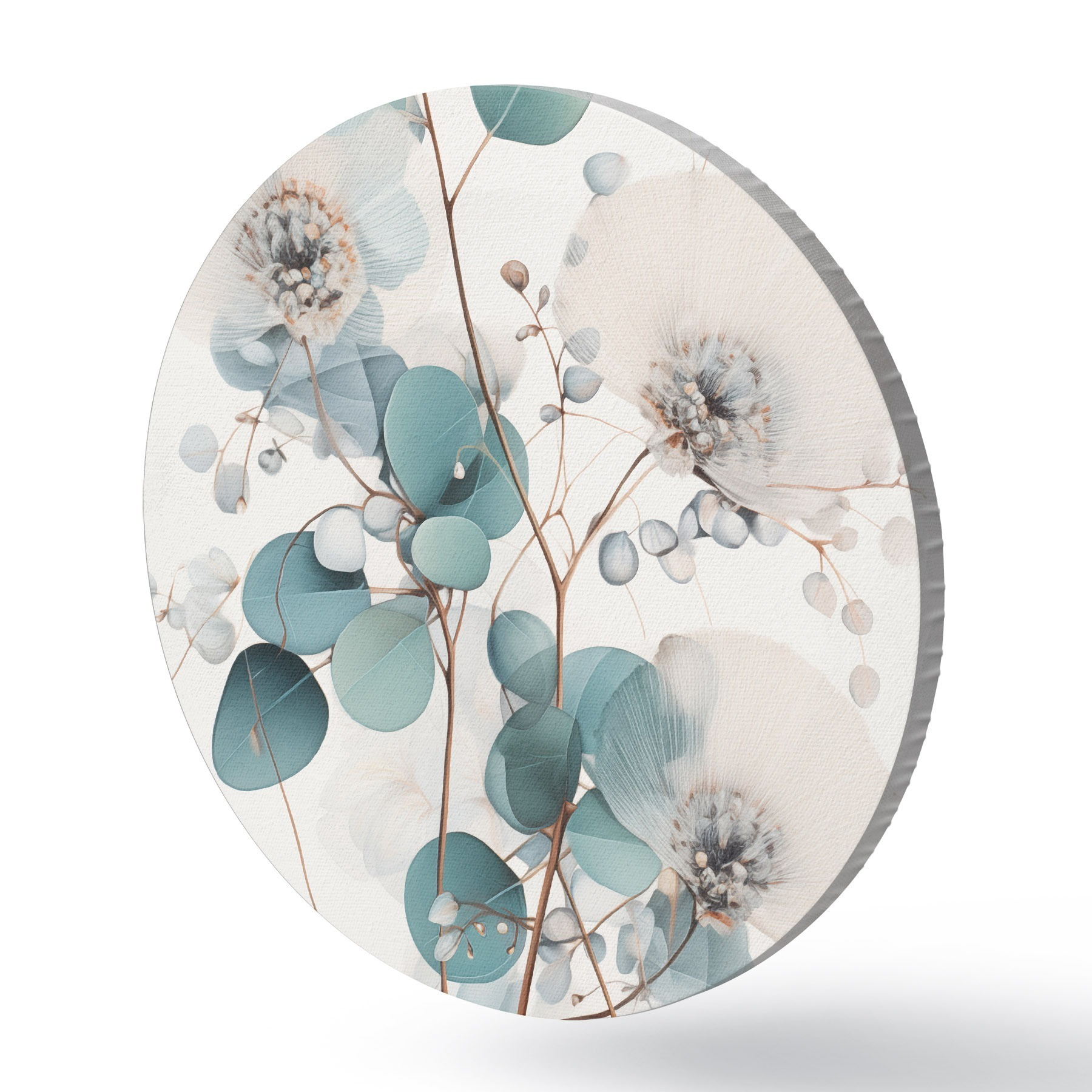 Runde Gemälde Eukalyptus-Blüten mit weißen Blütenblättern, gedeckten grünen Blättern an Zweigen r45946