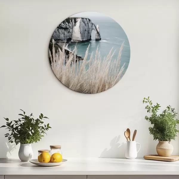 Runde Gemälde Meer und Felsbogen, Blick durch trockenes Gras r46142