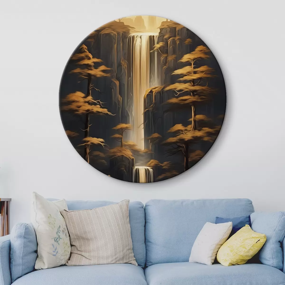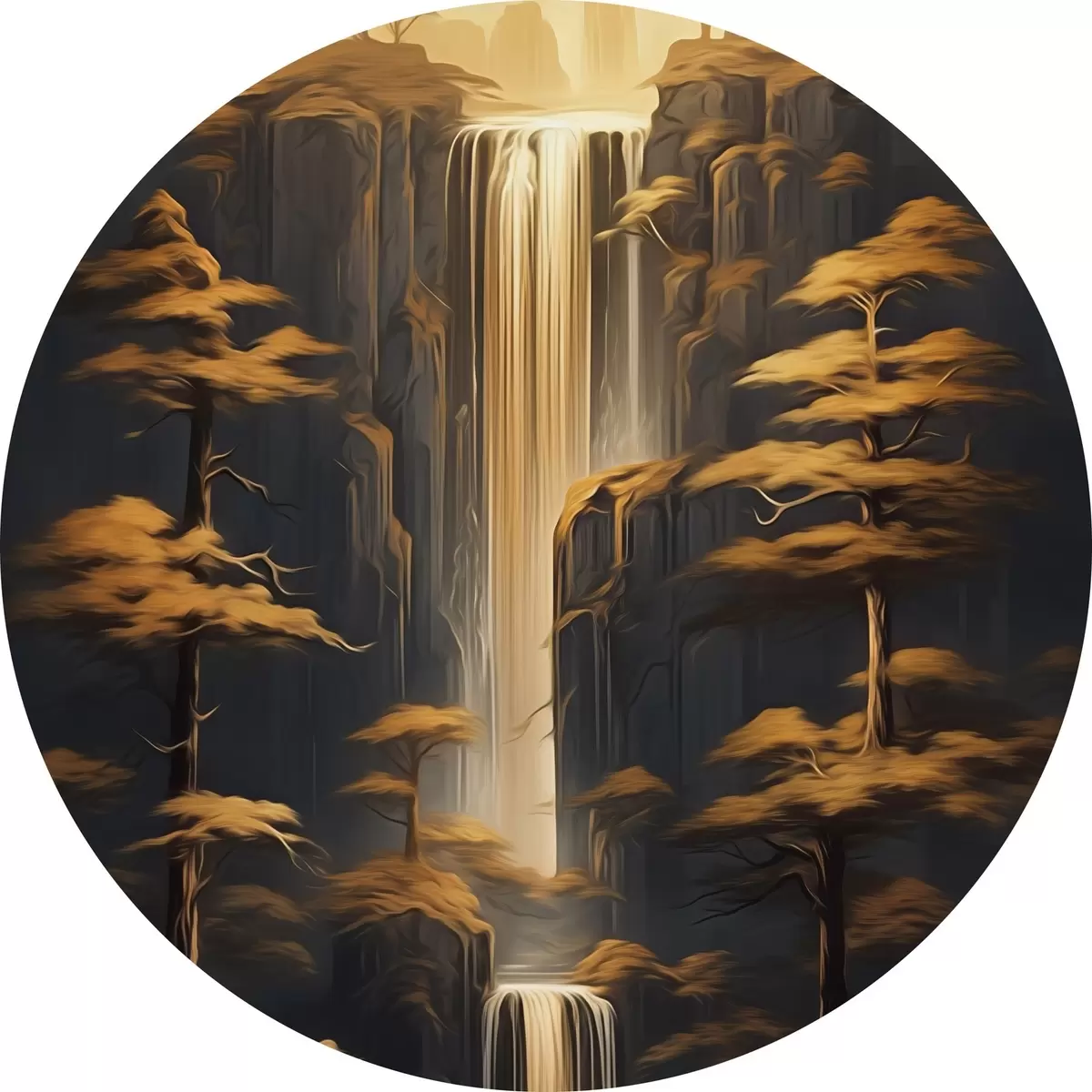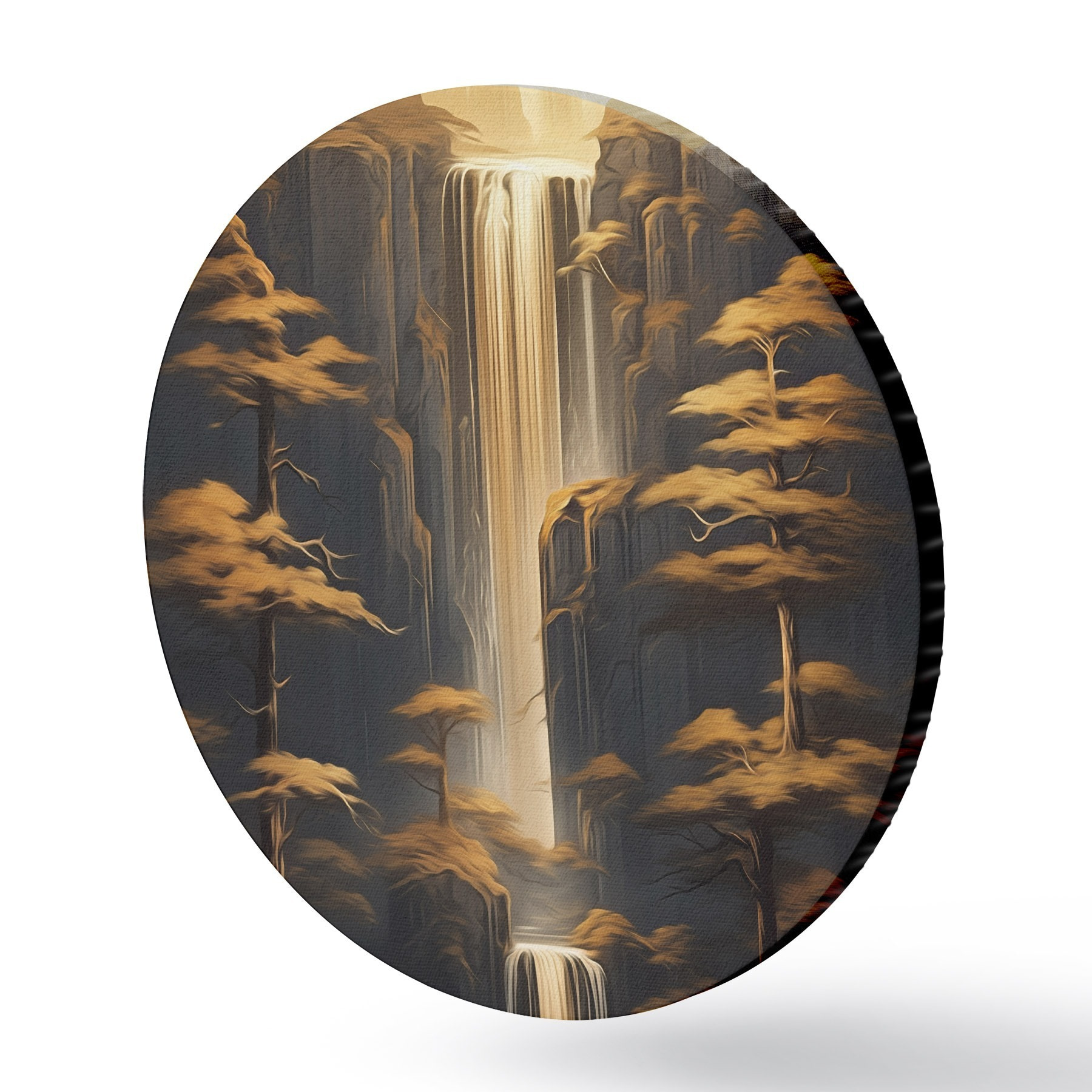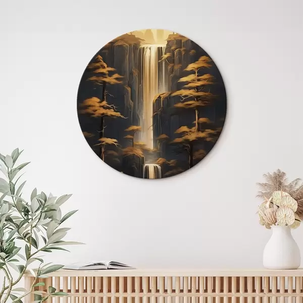 Runde Gemälde Hohe Klippen mit einem Wasserfall und Kiefern im Abendlicht r46151